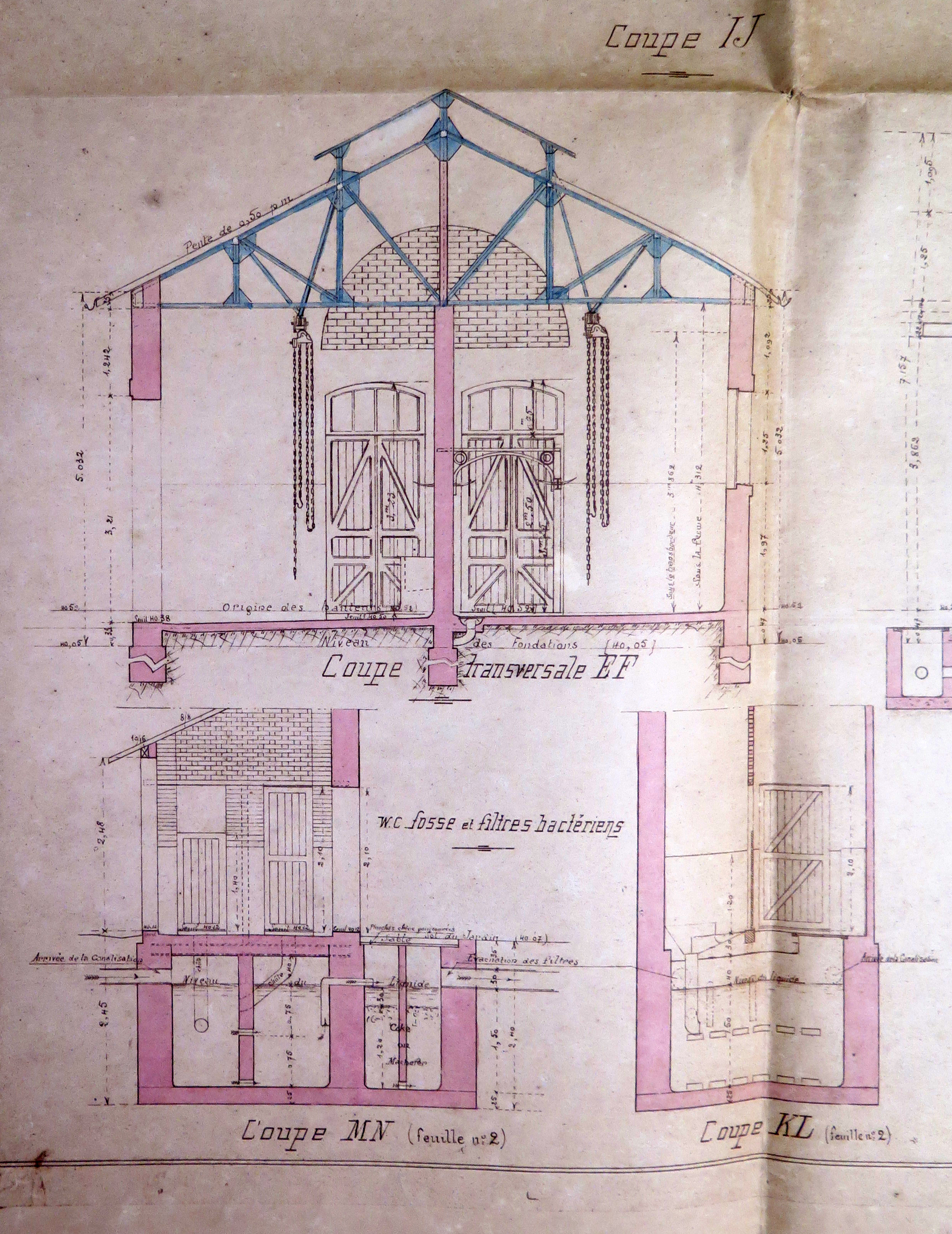 Tréguier, rue du Guindy : détail des coupes (feuille n° 4) de l'abattoir de la ville de Tréguier, 2 mai 1908 (Archives municipales de Tréguier, 1M9)Immatriculation