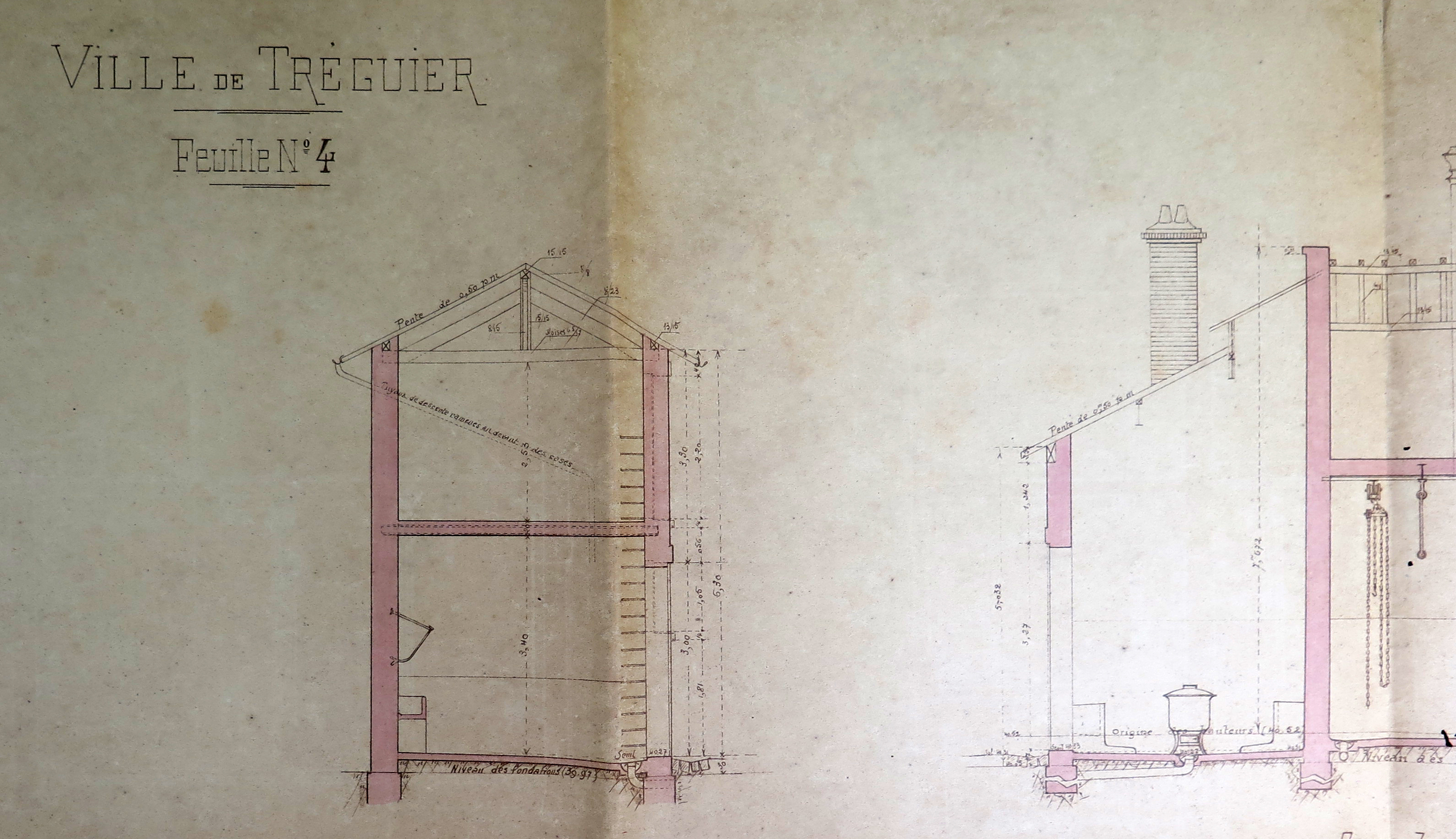 Tréguier, rue du Guindy : détail des coupes (feuille n° 4) de l'abattoir de la ville de Tréguier, 2 mai 1908 (Archives municipales de Tréguier, 1M9)Immatriculation