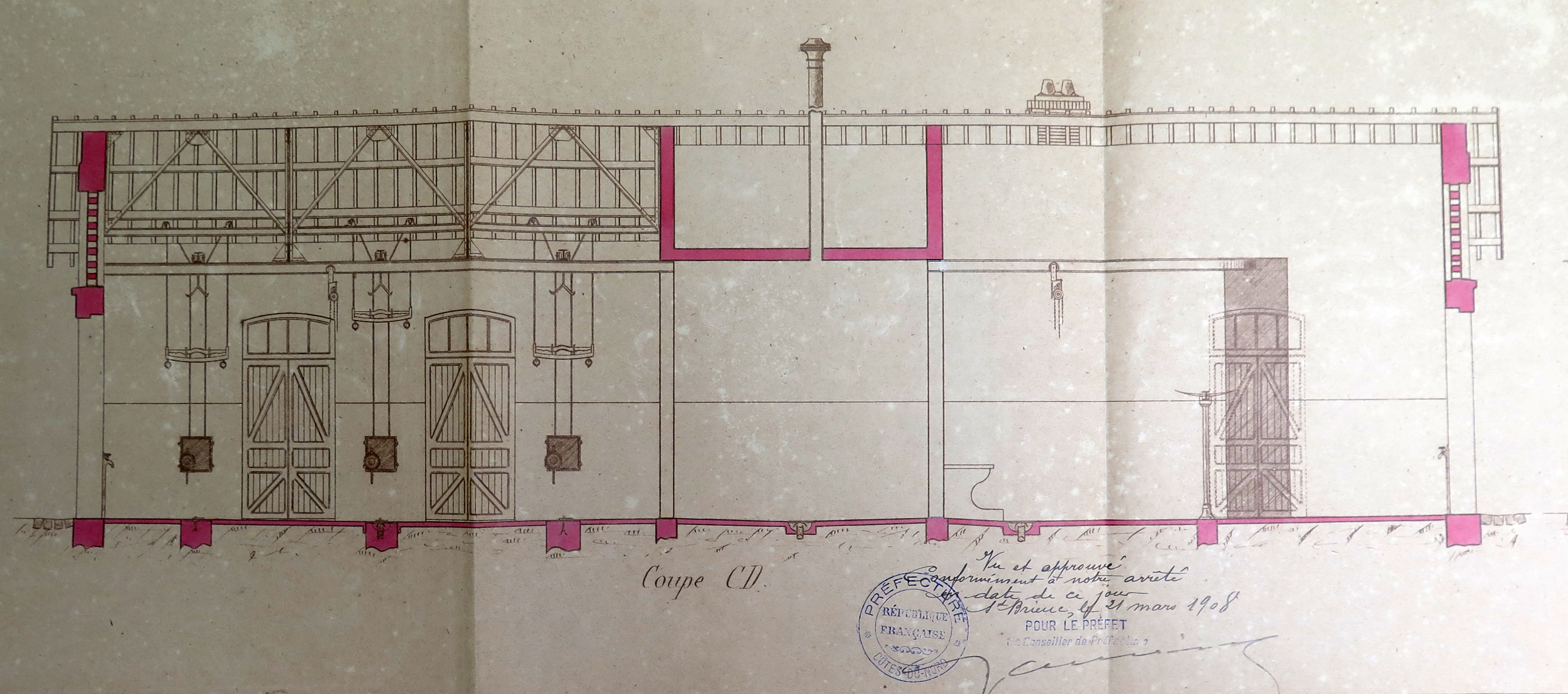 Tréguier, rue du Guindy : détail des coupes de l'abattoir de la ville de Tréguier, 1er novembre 1907 (Archives municipales de Tréguier, 4F15)