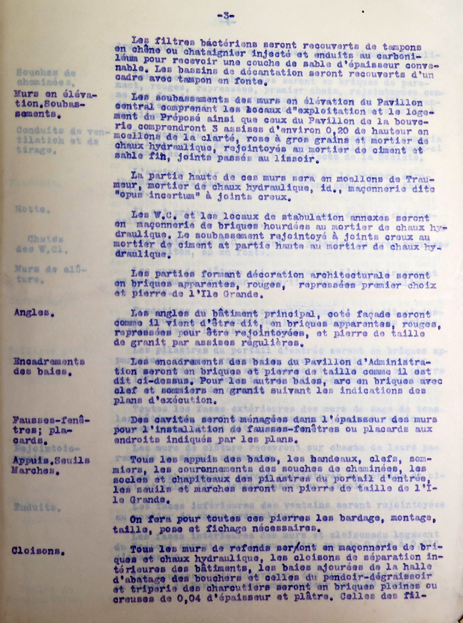 Tréguier, rue du Guindy : devis descriptif de l'abattoir de la ville de Tréguier par la Société générale des abattoirs municipaux de France, 1er novembre 1907, p. 3 (Archives municipales de Tréguier, 4F15)-