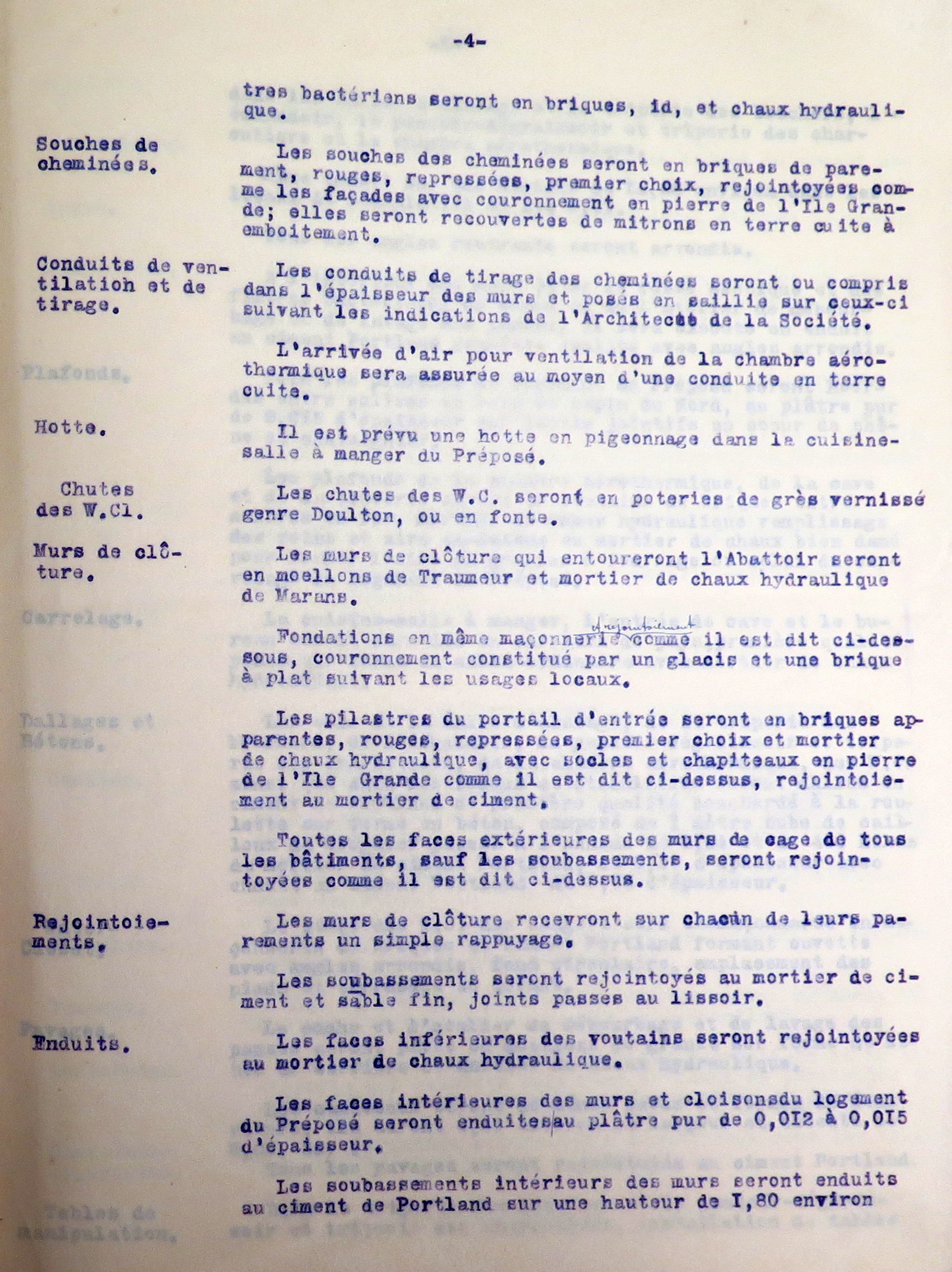 Tréguier, rue du Guindy : devis descriptif de l'abattoir de la ville de Tréguier par la Société générale des abattoirs municipaux de France, 1er novembre 1907, p. 4 (Archives municipales de Tréguier, 4F15)-