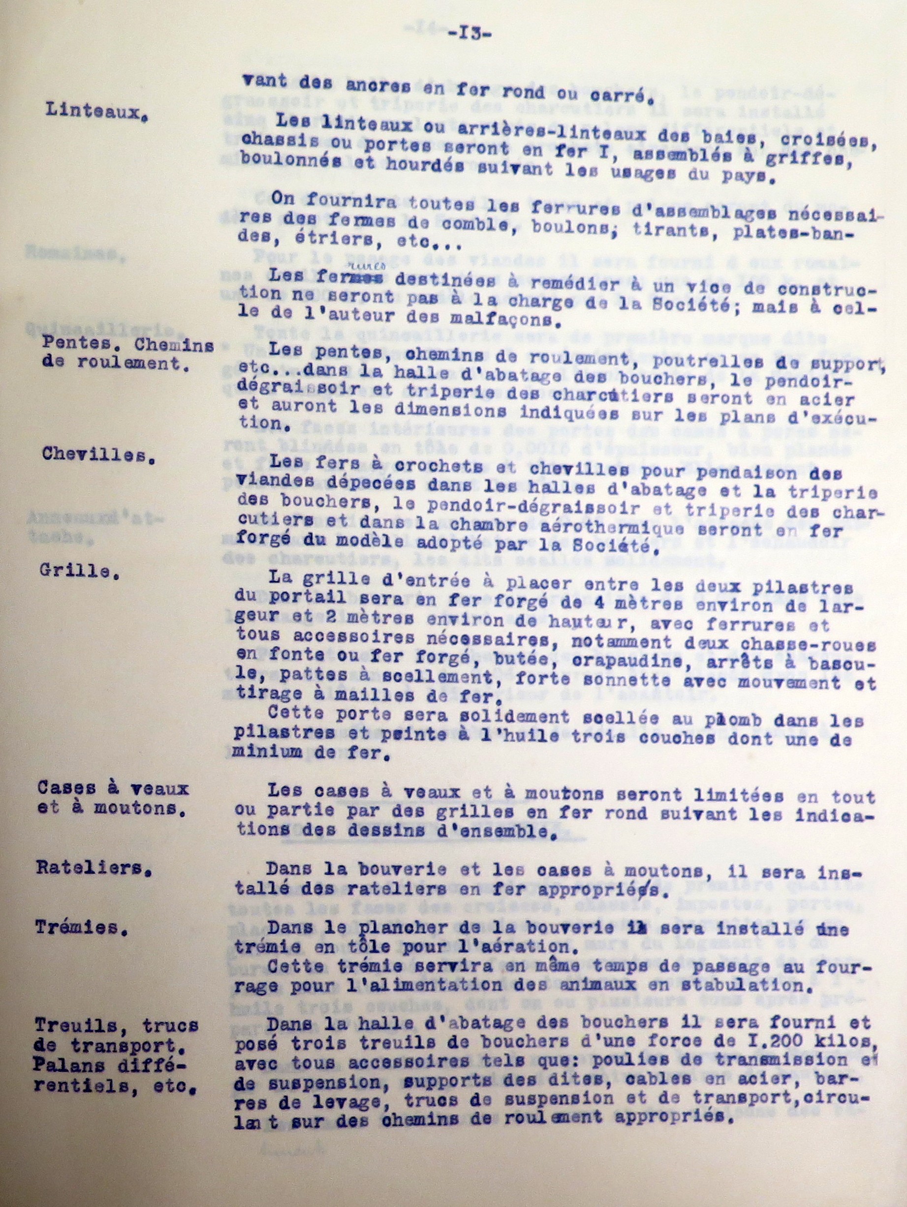 Tréguier, rue du Guindy : devis descriptif de l'abattoir de la ville de Tréguier par la Société générale des abattoirs municipaux de France, 1er novembre 1907, p. 13 (Archives municipales de Tréguier, 4F15)-