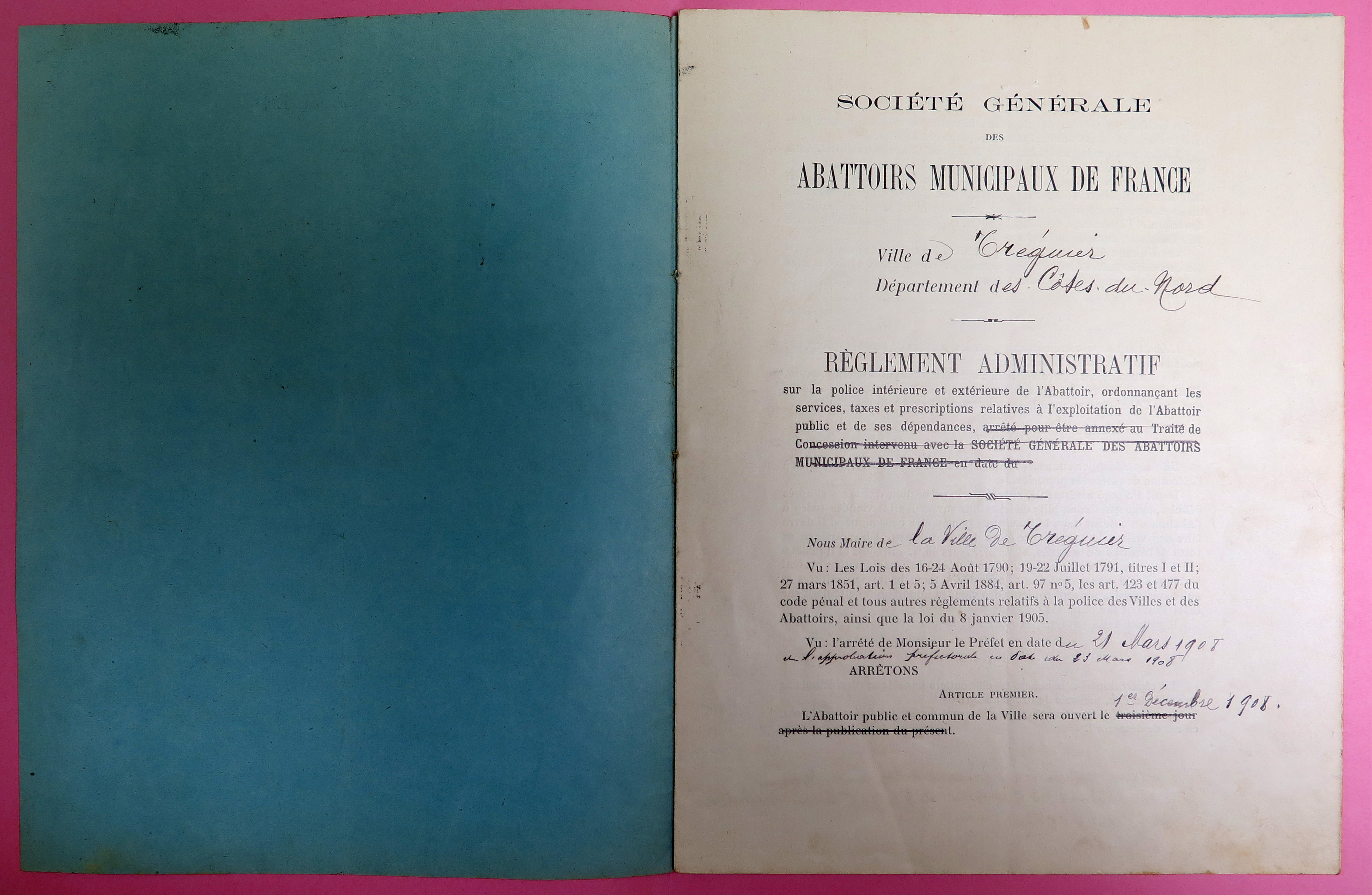 Réglement administratif de l'abattoir de la ville de Tréguier par la Société générale des abattoirs municipaux de France, 9 novembre 1908 (Archives municipales de Tréguier, 4F15)