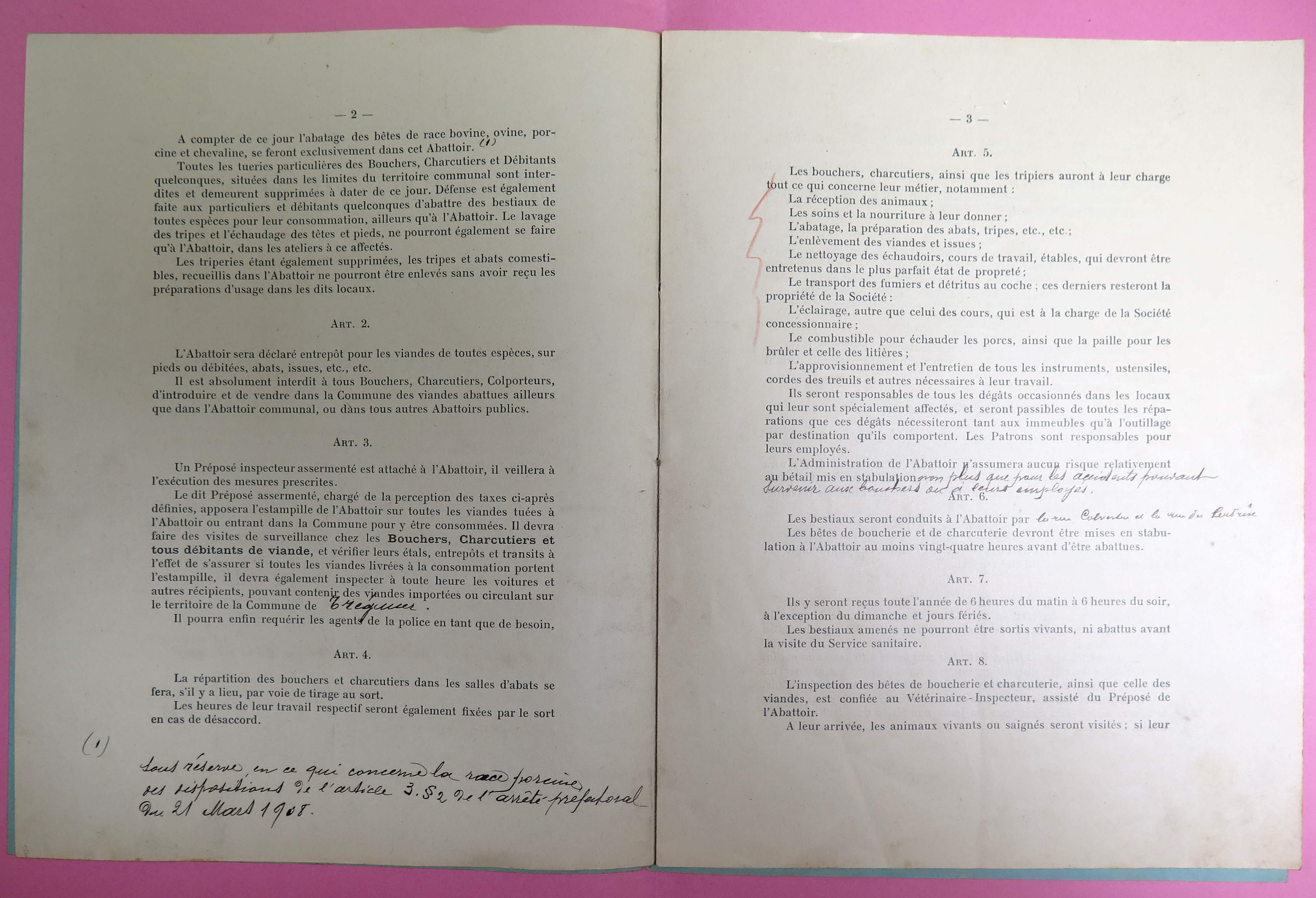 Réglement administratif de l'abattoir de la ville de Tréguier par la Société générale des abattoirs municipaux de France, 9 novembre 1908 (Archives municipales de Tréguier, 4F15)