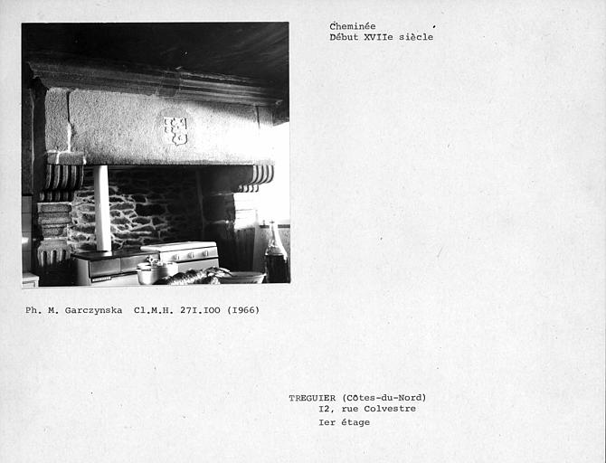Tréguier, 12 rue Colvestre : maison à pan de bois, cheminée, 1966 (Ministère de la Culture (France), Médiathèque de l'architecture et du patrimoine (Centre de recherche des monuments historiques - CRMH, diffusion RMN), sap91_mh00271100_p)Immatriculation