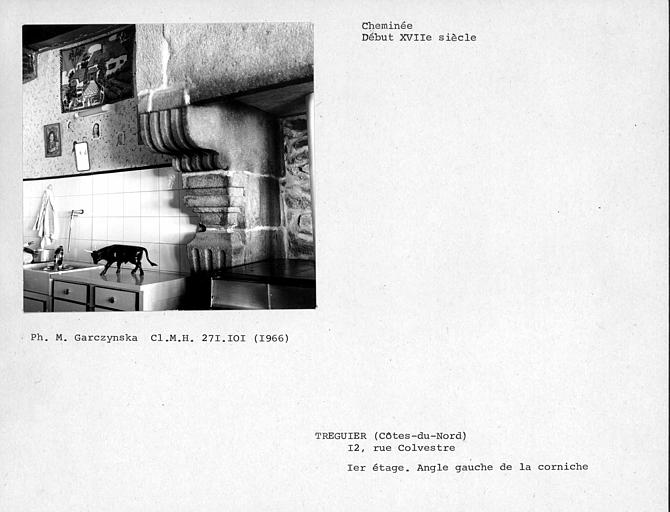Tréguier, 12 rue Colvestre : maison à pan de bois, cheminée, détail du piédroit, 1966 (Ministère de la Culture (France), Médiathèque de l'architecture et du patrimoine (Centre de recherche des monuments historiques - CRMH, diffusion RMN), sap91_mh00271101_p)Immatriculation