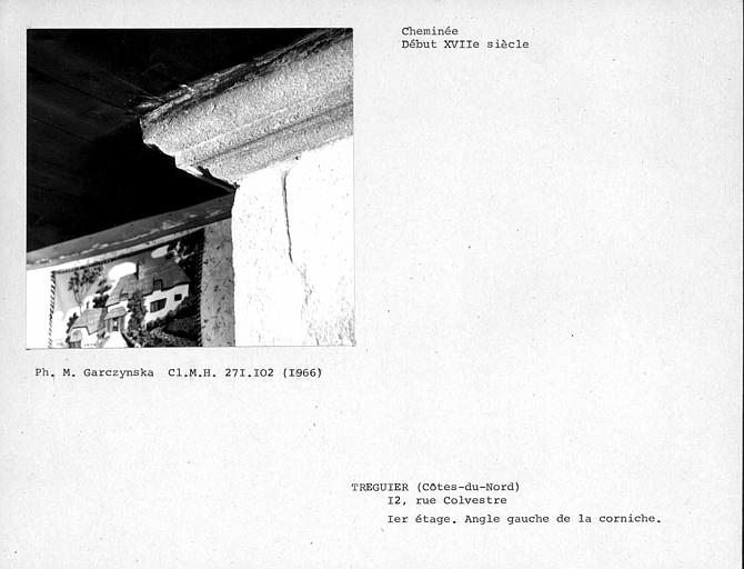 Tréguier, 12 rue Colvestre : maison à pan de bois, cheminée, détail de la corniche, 1966 (Ministère de la Culture (France), Médiathèque de l'architecture et du patrimoine (Centre de recherche des monuments historiques - CRMH, diffusion RMN), sap91_mh00271102_p)Immatriculation