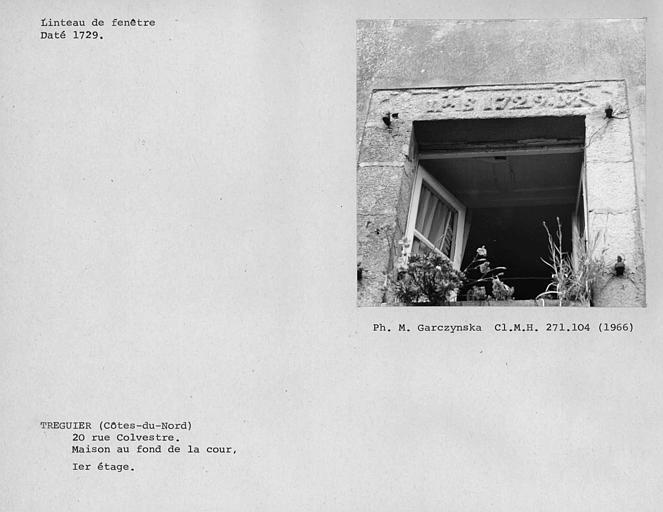 Tréguier, 20 rue Colvestre : maison à pan de bois, façade arrière nord, sur un linteau de fenêtre, on peut lire : "IHS [monogramme du Christ] 1729 1966 MR" (Ministère de la Culture (France), Médiathèque de l'architecture et du patrimoine (Centre de recherche des monuments historiques - CRMH, diffusion RMN), sap91_mh00271104_p)Immatriculation