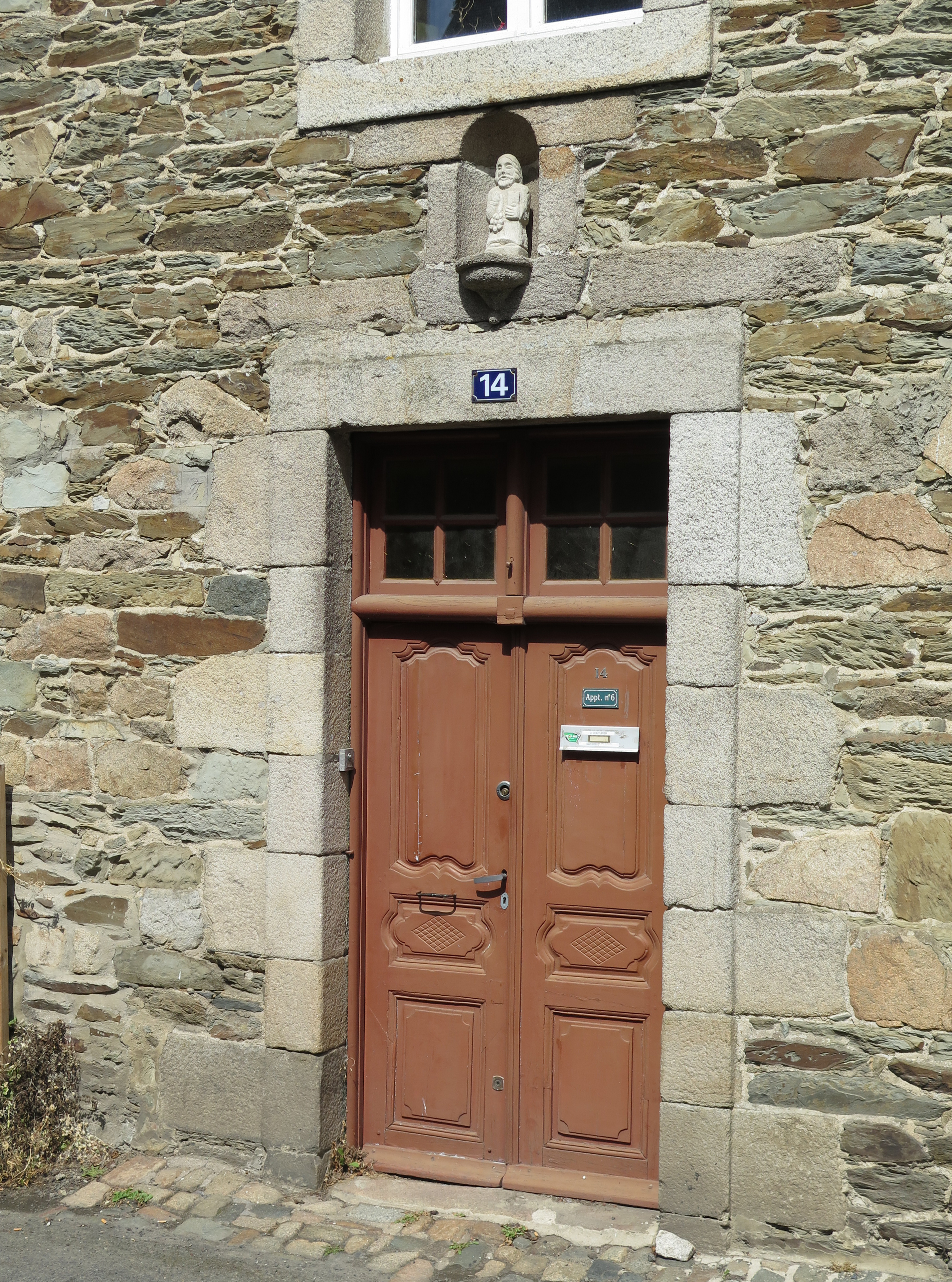 Tréguier, 12-16 rue des Perdreries (Perderies) : immeuble à logements dit "Hôtel de Coëtivy", élévation sud sur rue, porte à linteau droit surmontée d'une niche à statue (fin du 18e siècle-début du 19e siècle)Immatriculation