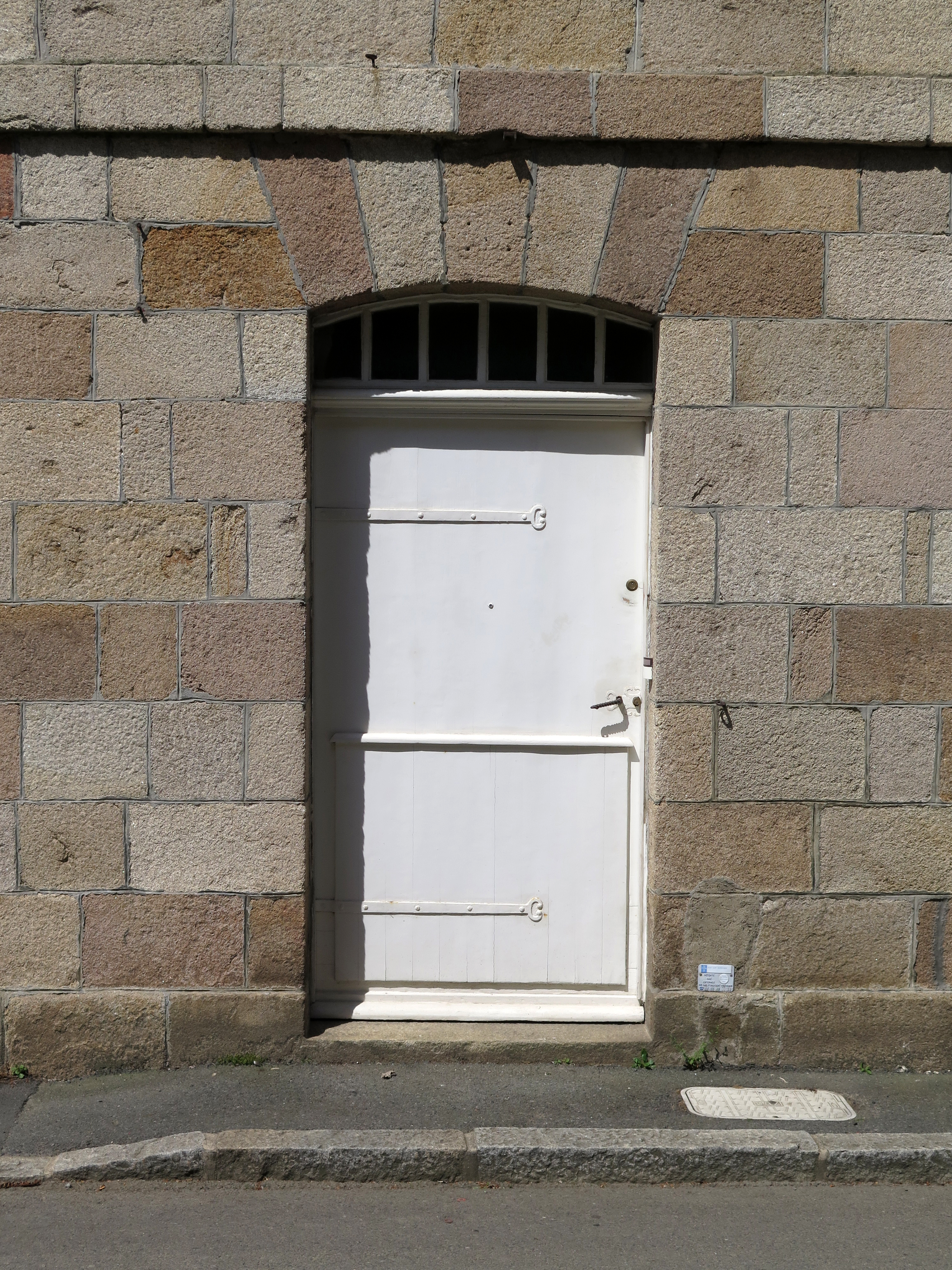 Tréguier, 1 rue Saint-François - rue des Perdreries (Perderies) : demeure dite "Hôtel de Kermorvan", élévation sud sur rue, détail d'une porte à linteau en arc plein cintreImmatriculation
