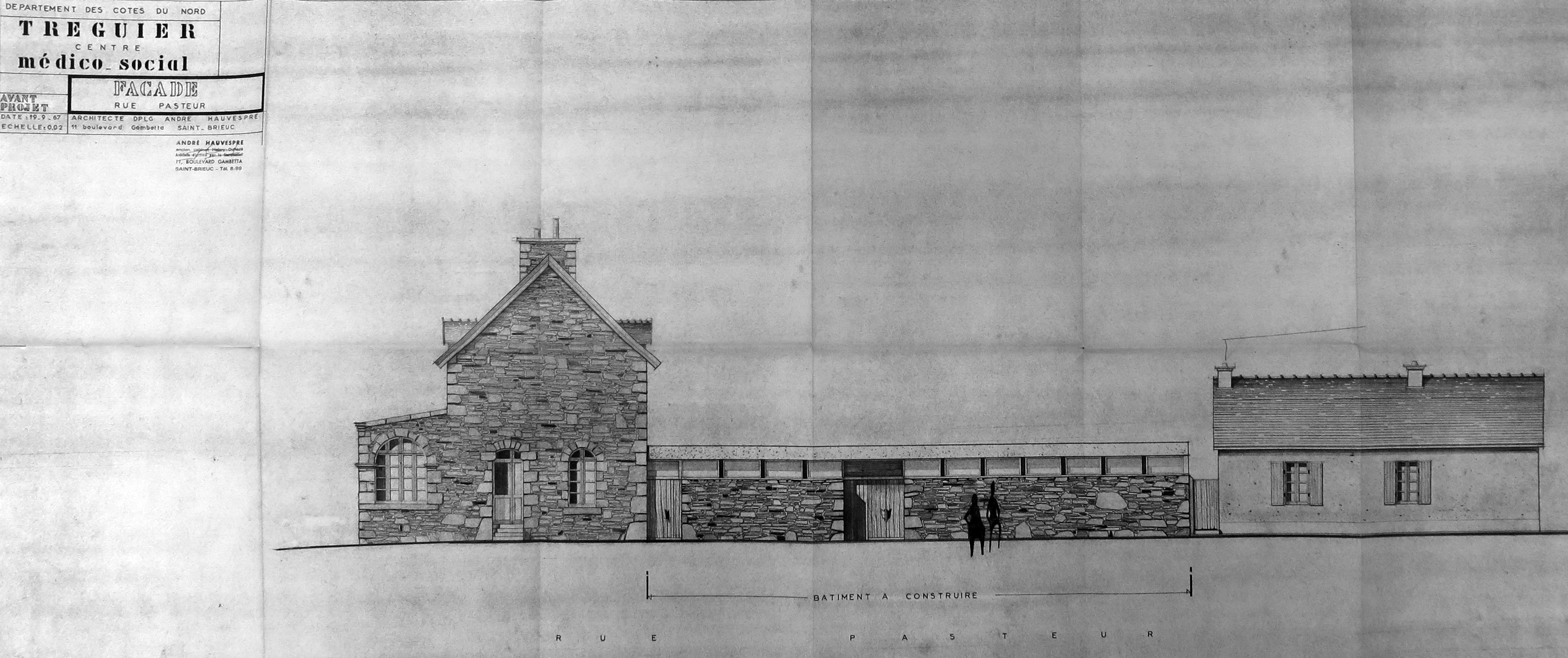 Tréguier, rue Pasteur : projet de centre médico-social par l'architecte André Hauvespre, élévation de la façade sur rue, 19 septembre 1967 (Archives municipales de Tréguier, 6M4)Immatriculation