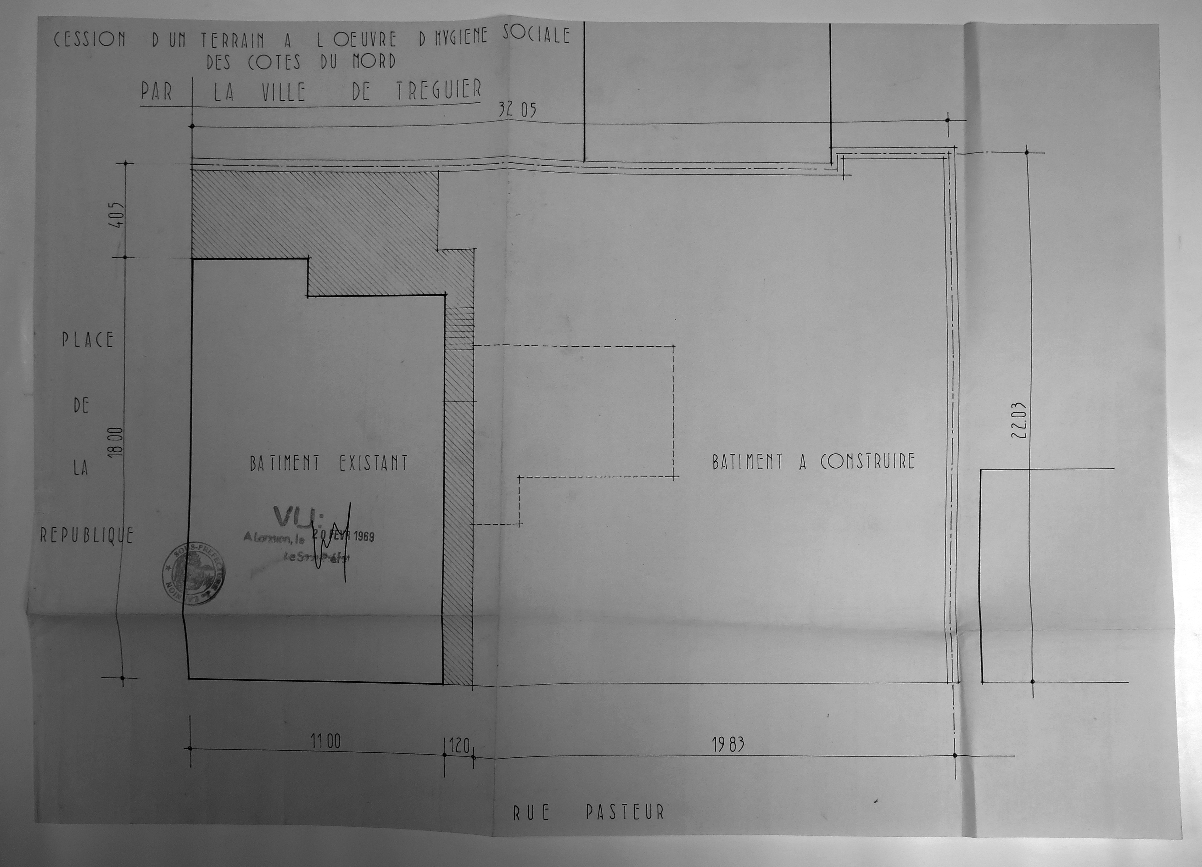 Tréguier, rue Pasteur : projet de centre médico-social par l'architecte André Hauvespre, cession d'un terrain à l'oeuvre d'hygiène sociale des Côtes-du-Nord par la ville de Tréguier, document visé le 20 février 1969 (Archives municipales de Tréguier, 6M4)Immatriculation