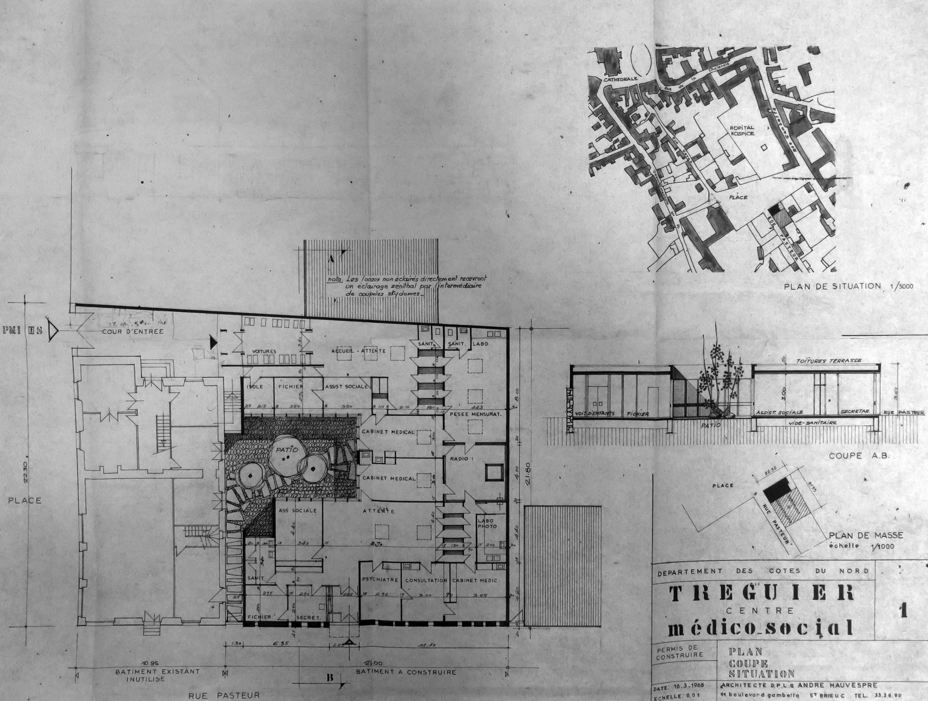Tréguier, rue Pasteur : projet de centre médico-social par l'architecte André Hauvespre, 16 mars 1968 (Archives municipales de Tréguier, 6M4)Immatriculation