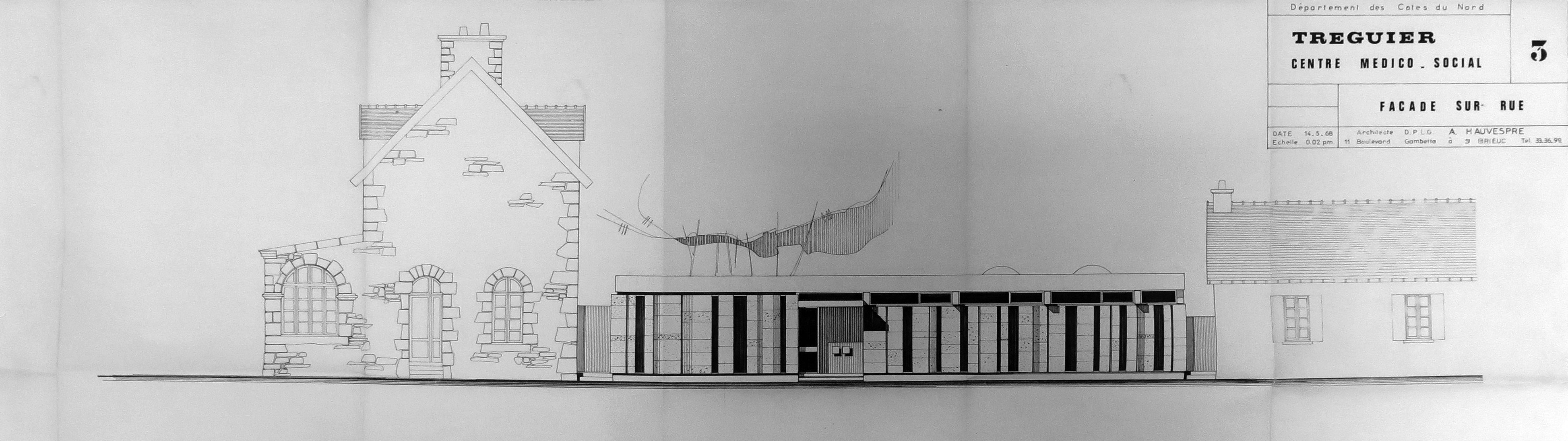 Tréguier, rue Pasteur : projet de centre médico-social par l'architecte André Hauvespre, élévation sur rue, 14 mai 1968 (Archives municipales de Tréguier, 6M4)Immatriculation