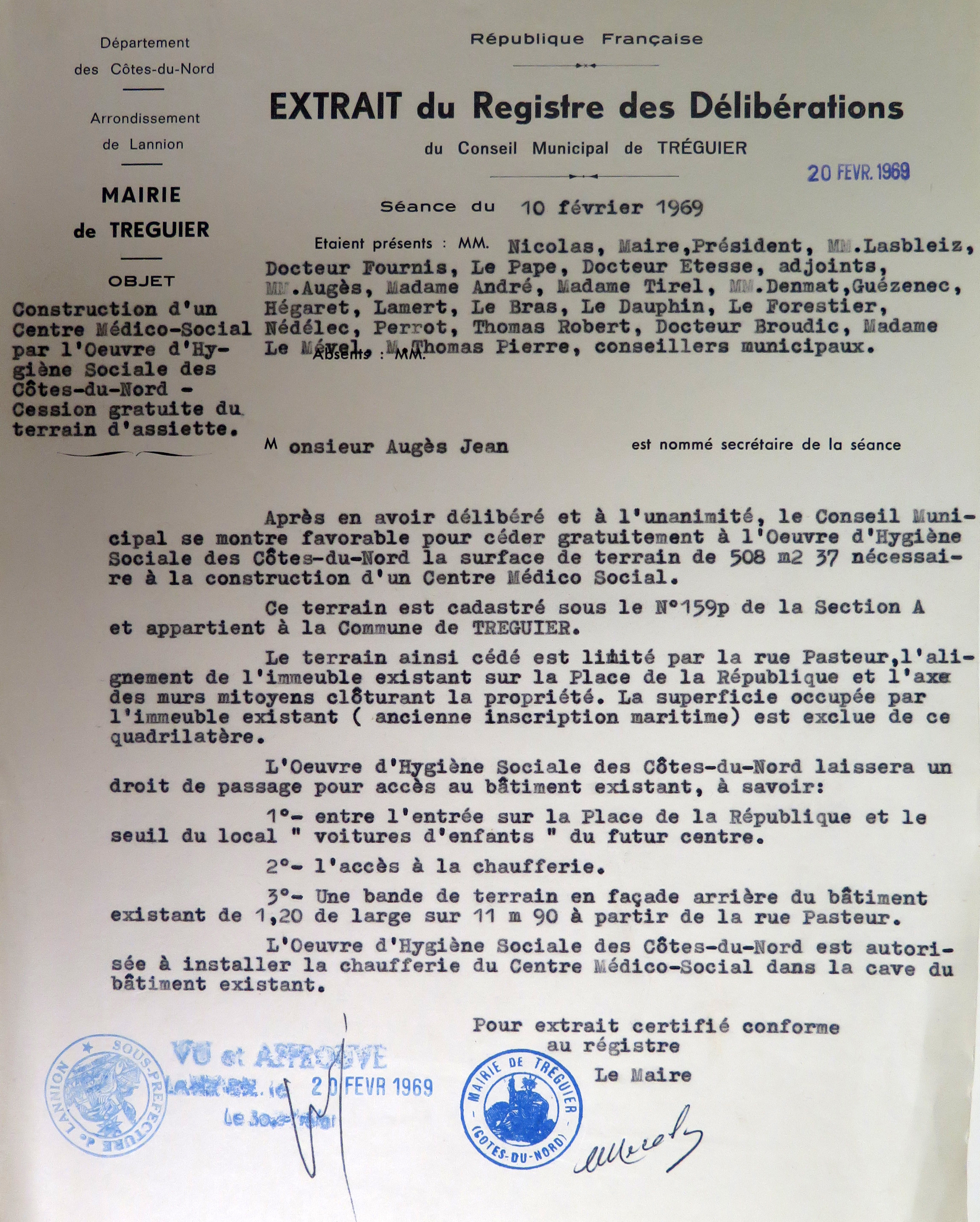Extrait du registre des délibérations du conseil municipal de Tréguier au sujet du terrain du futur centre médico-social, 10 février 1969 (Archives municipales de Tréguier, 6M4)Immatriculation