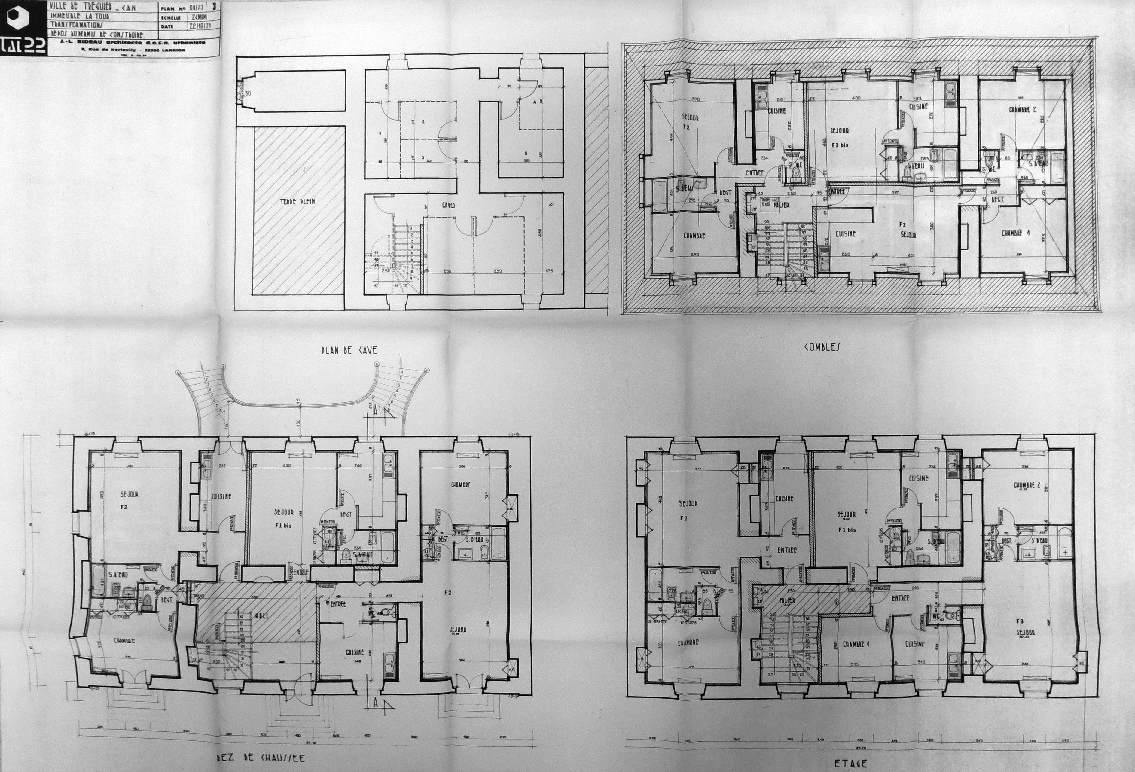 Projet de transformation en immeuble à logements de l'Hôtel de La Tour par l'architecte Jean-Louis Bideau, plan général, 22 octobre 1979 (Archives municipales de Tréguier, 6M6)Immatriculation