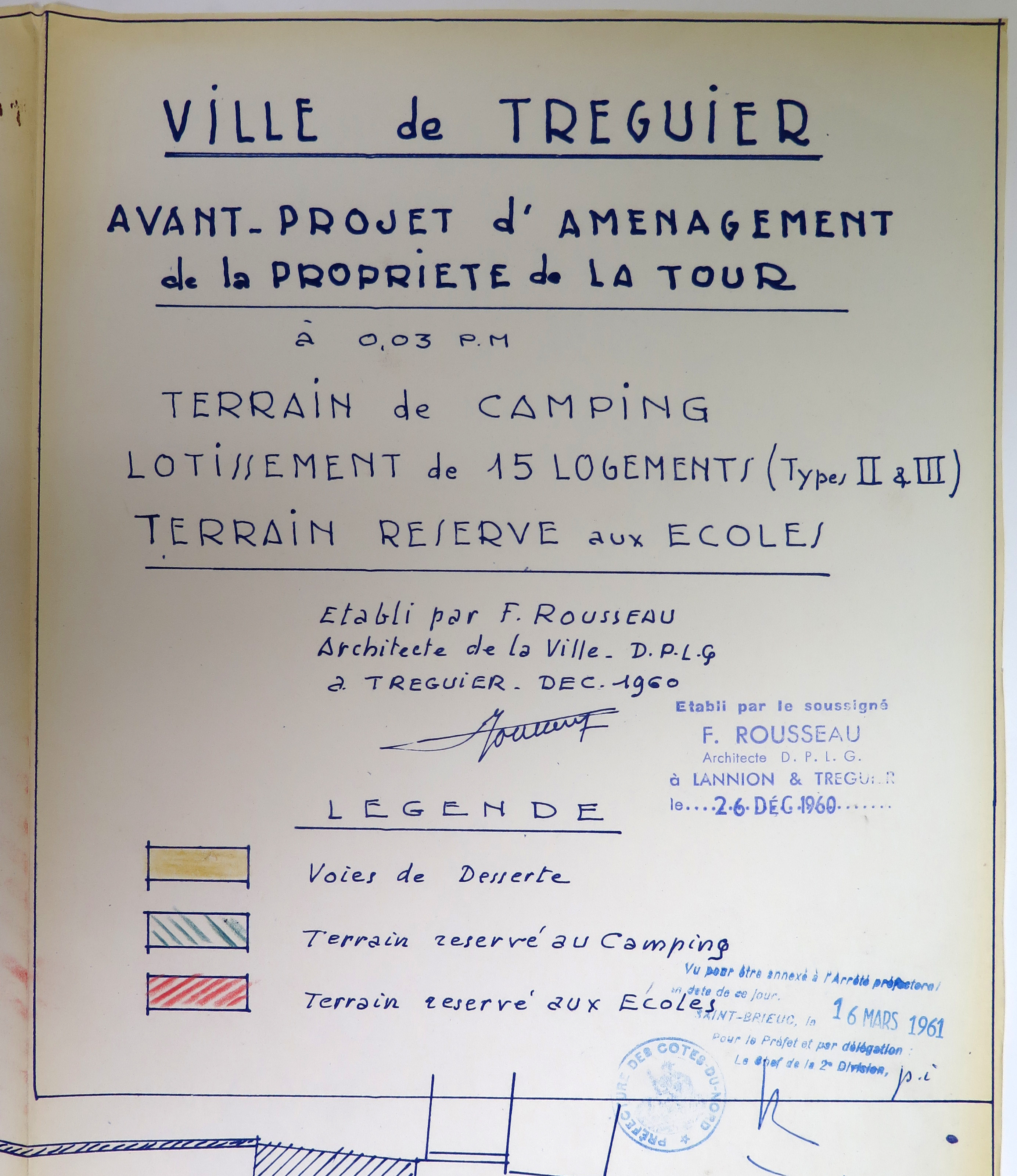 Tréguier, rue des Perdreries (Perderies) : légende de l'avant-projet d'aménagement de la propriété de La Tour par l'architecte de la ville F. Rousseau (terrain de camping, lotissement de 15 logements type II et III, terrain réservé aux écoles), 26 décembre 1960 (Archives municipales de Tréguier, 6M5)Immatriculation
