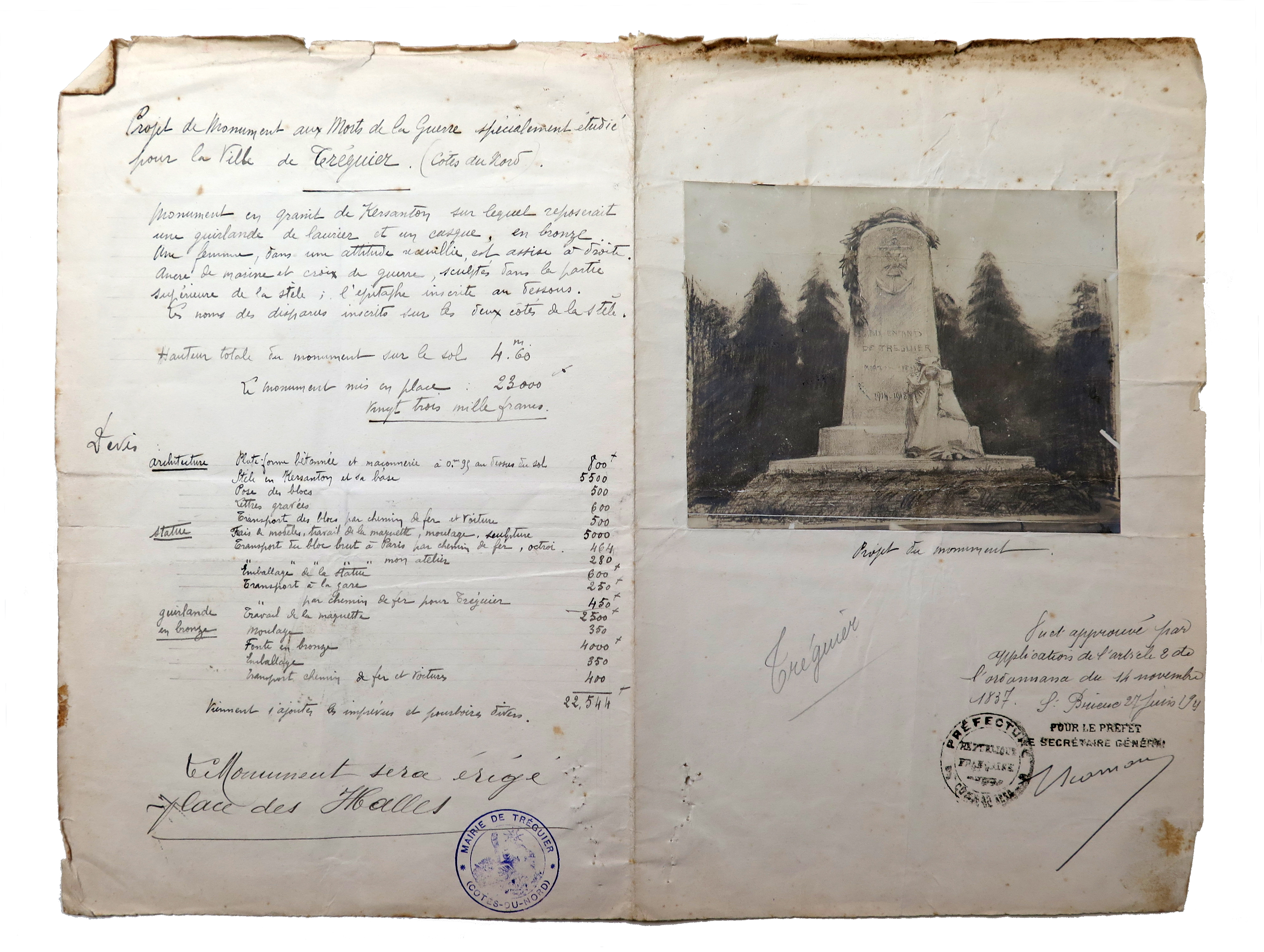 Devis et dessin du projet de monument aux morts de Tréguier par le sculpteur Francis Renaud, devis non daté (novembre 1920 ?), validé par la préfecture des Côtes-du-Nord le 27 juin 1921 (Archives municipales de Tréguier, 1M5)Immatriculation