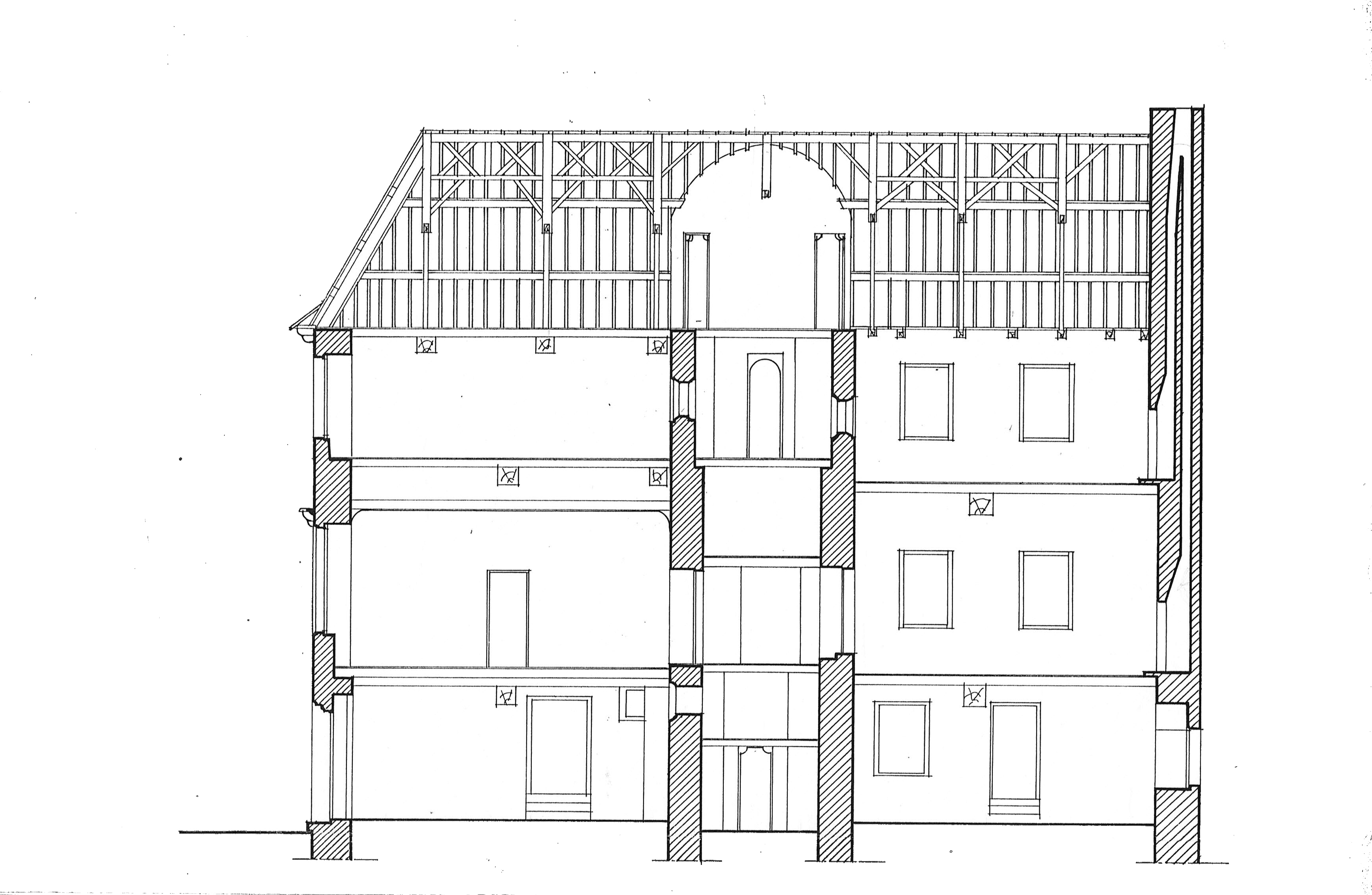 Tréguier, 22 rue Colvestre : manoir urbain, coupe longitudinale (dessin : Daniel Leloup, architecte)Immatriculation