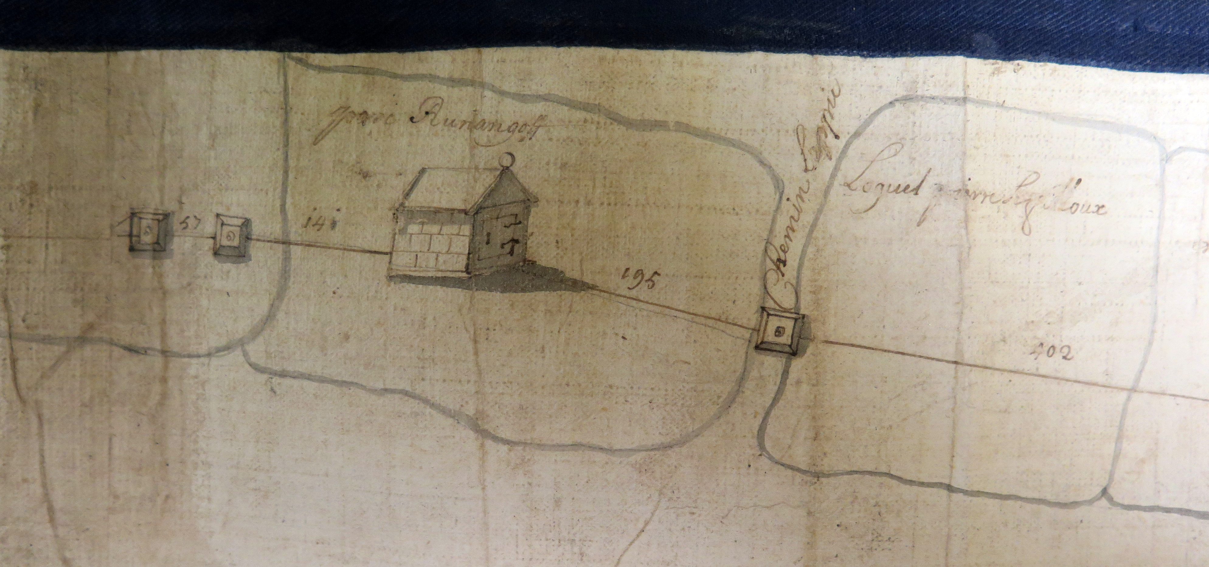 Détail du plan de la conduite d'eau de la ville de Tréguier au niveau de Parc Runangoff par Charles Symon, maître peintre, 1610 (Archives communales de Tréguier de Tréguier, 1Fi8)Immatriculation