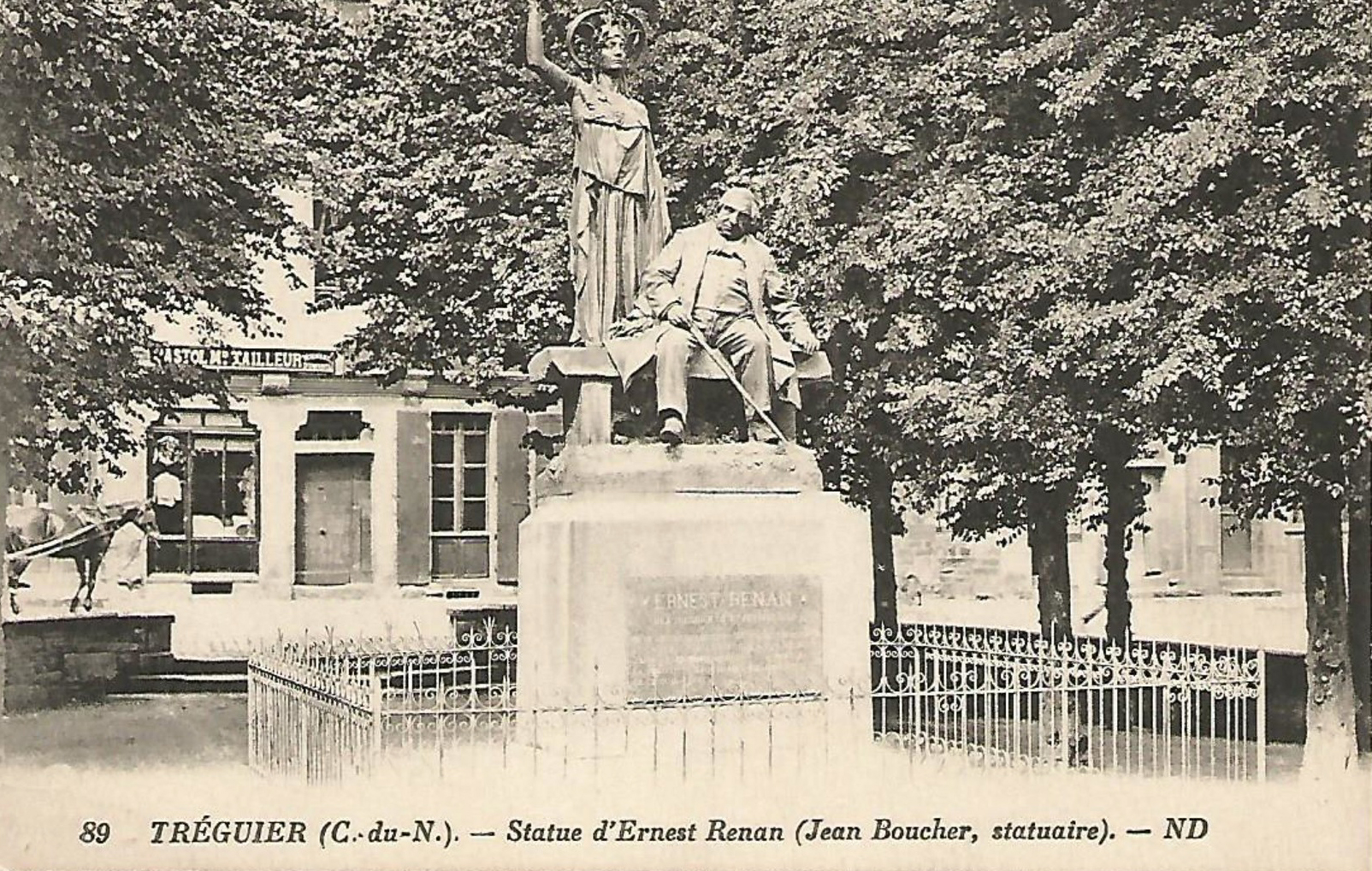 Tréguier, place du Martray : statue d'Ernest Renan et de la déesse Pallas Athéna, carte postale (collection particulière)Immatriculation