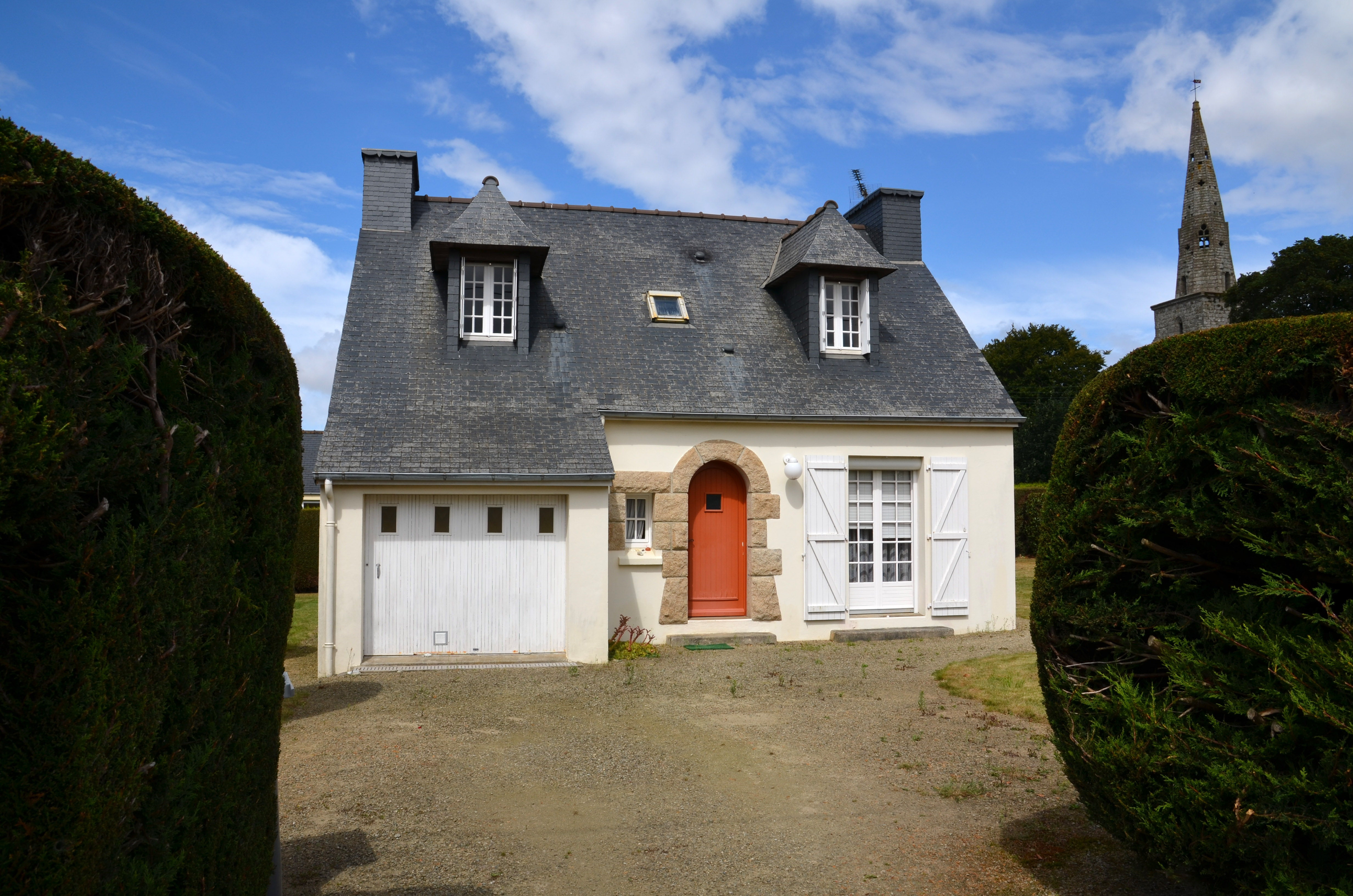 Tréguier, rue de la Corderie : lotissement de Parc Tallion, maison individuelle (vers 1975). En arrière-plan, la tour Saint-MichelImmatriculation