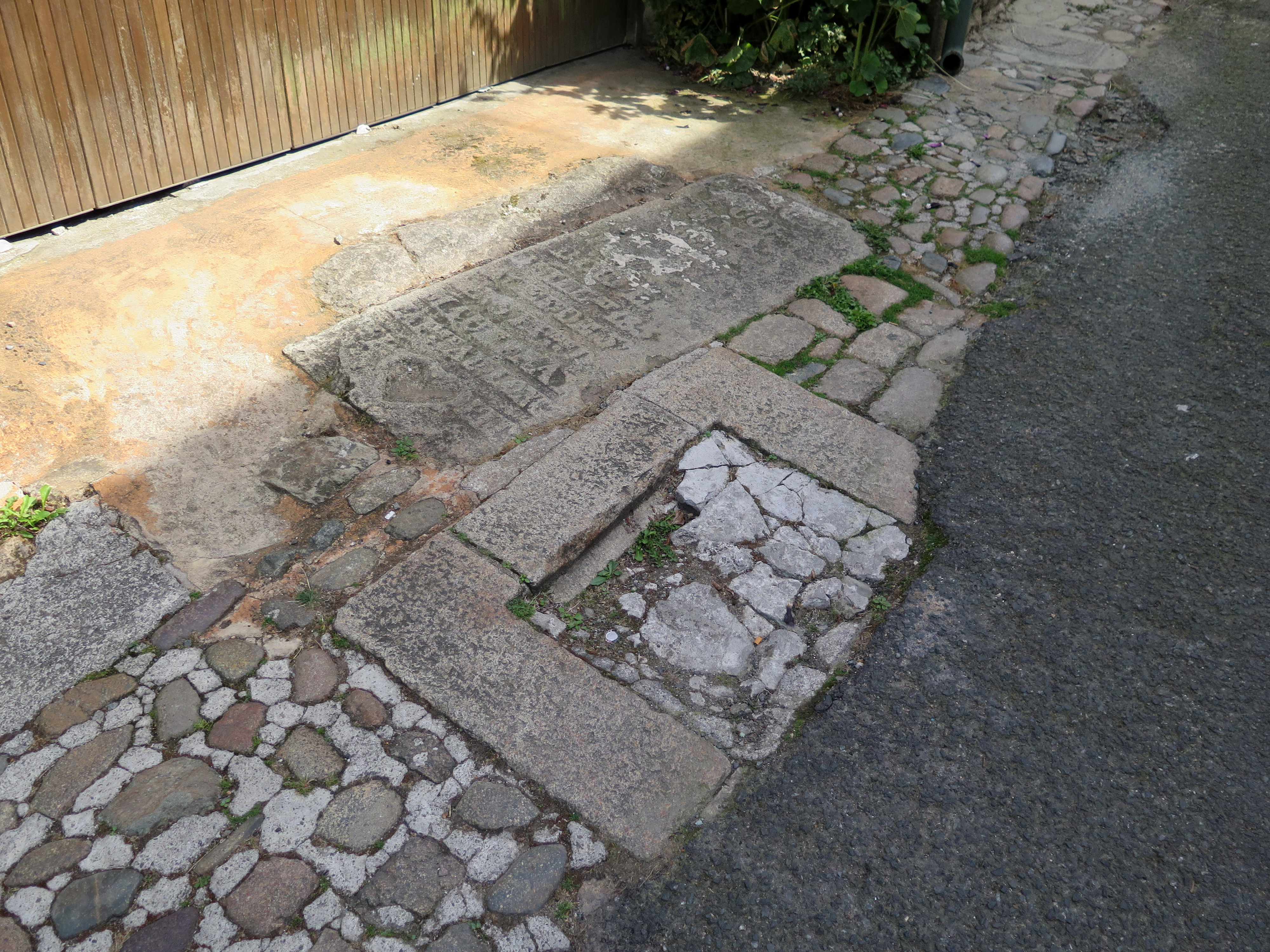 Tréguier, rue Saint-François : regard de la conduite d'eau venant de l'aqueduc du Guindy et pierre tombale (remploi)Immatriculation