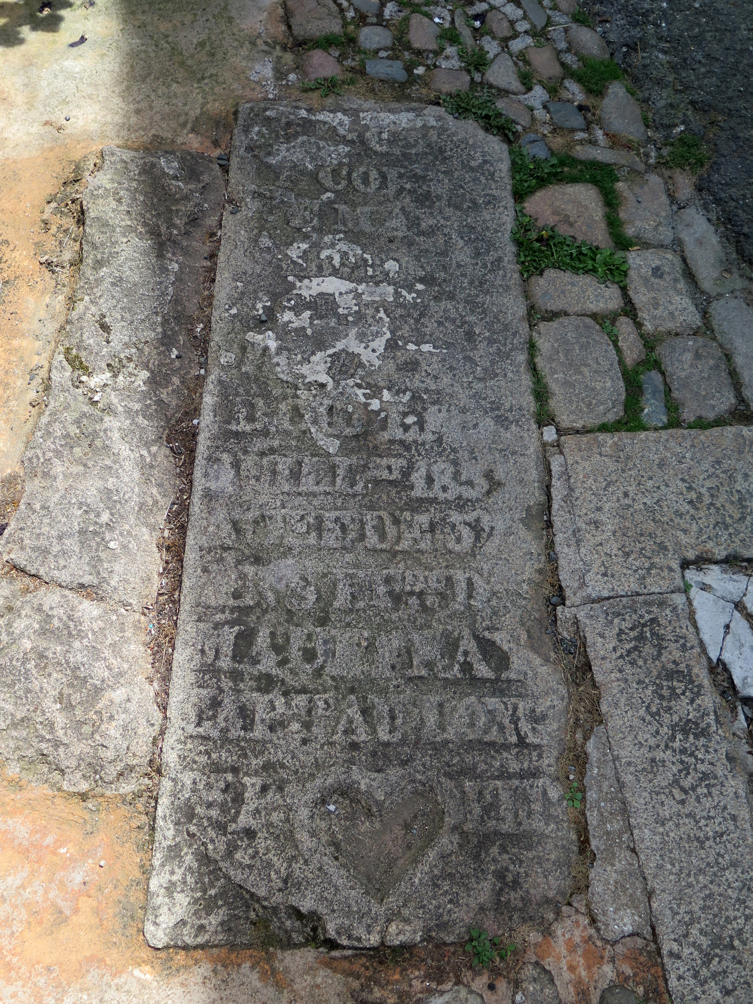 Tréguier, rue Saint-François : pierre tombale (remploi) située à côté du regard de la conduite d'eau venant de l'aqueduc du GuindyImmatriculation