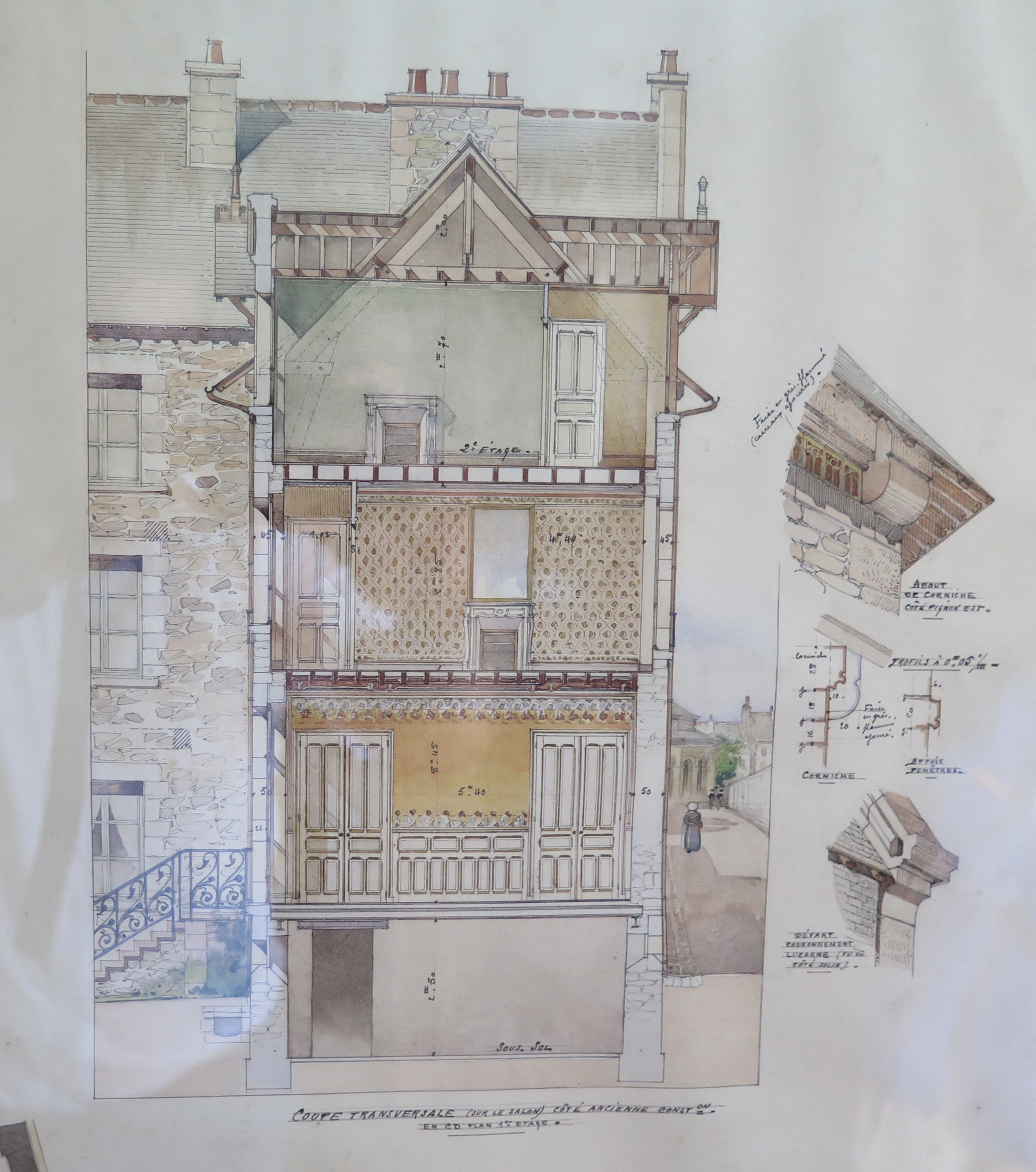 Tréguier, 8 rue Lamennais : maison, coupe transversale de l'aile nord par Émile Brunet, architecte, Paris, 4 avril 1904 (collection particulière, planche n° 1)Immatriculation
