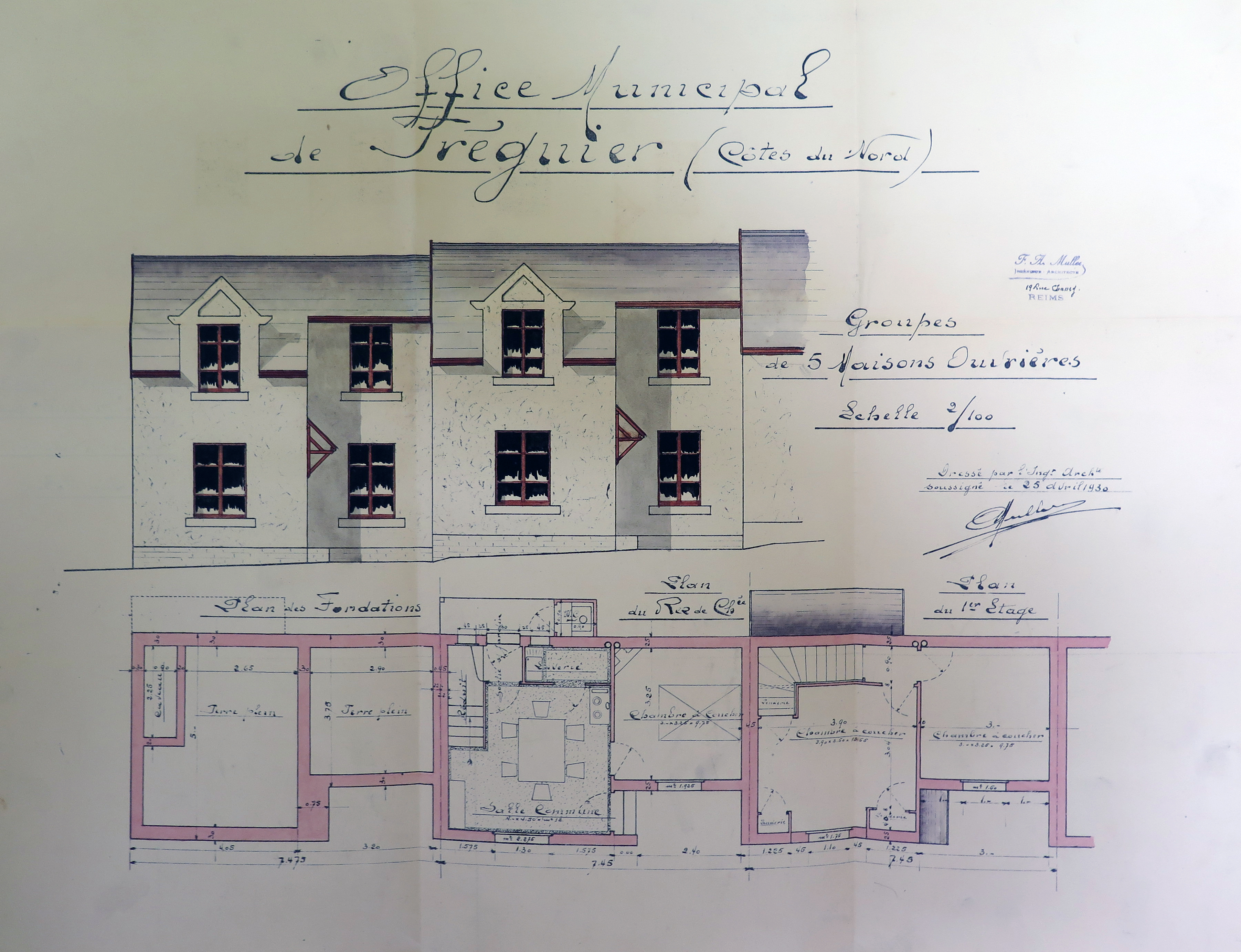 Tréguier : plan et élévation d'un groupe de 5 maisons ouvrières, projet de l'ingénieur architecte Muller de Reims, 25 avril 1930 (Archives municipales de Tréguier, 1W5)Immatriculation