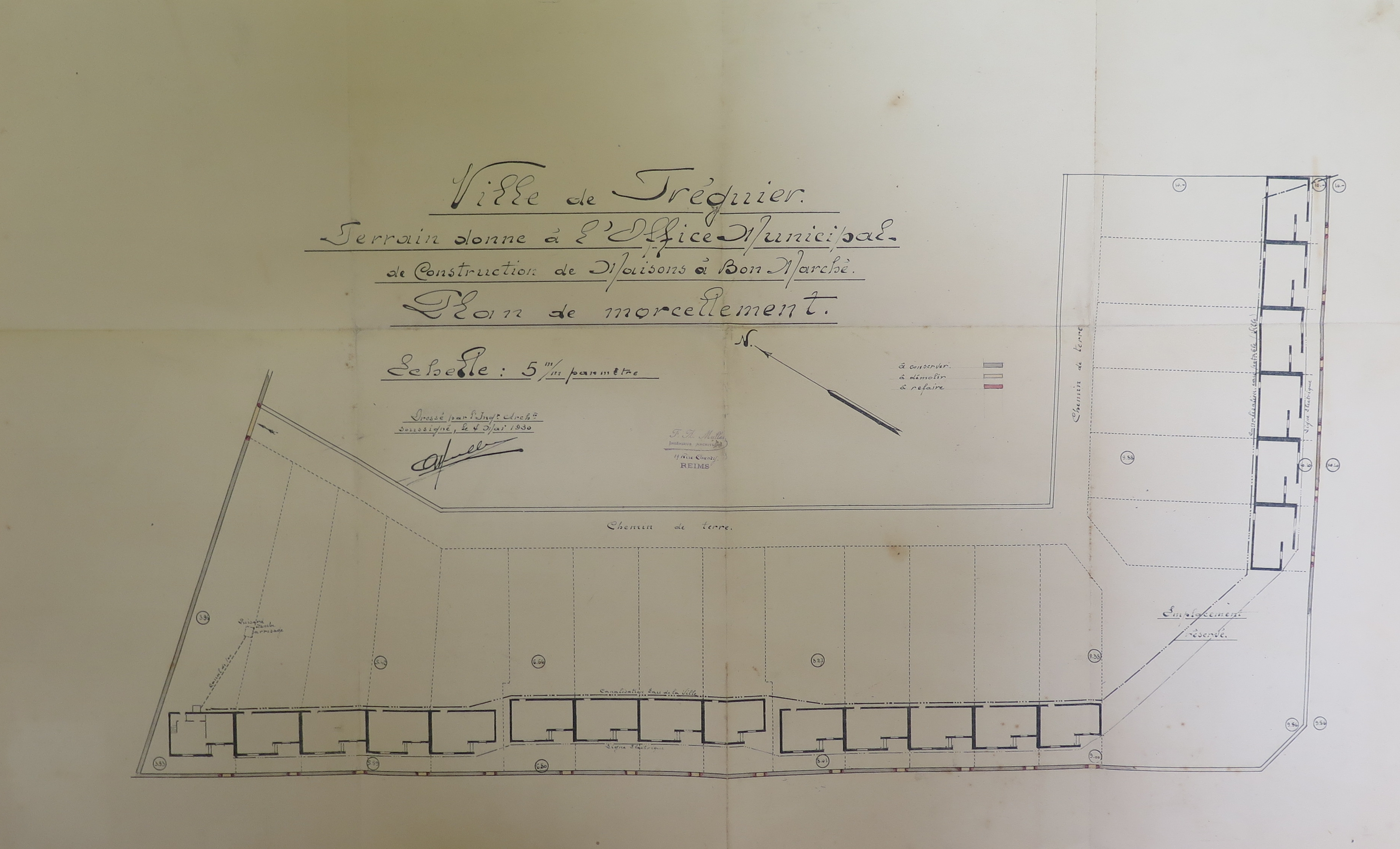 Tréguier : plan de morcellement pour la construction de maisons à bon marché, projet de l'ingénieur architecte Muller de Reims, 4 mai 1930 (Archives municipales de Tréguier, 1W5)Immatriculation