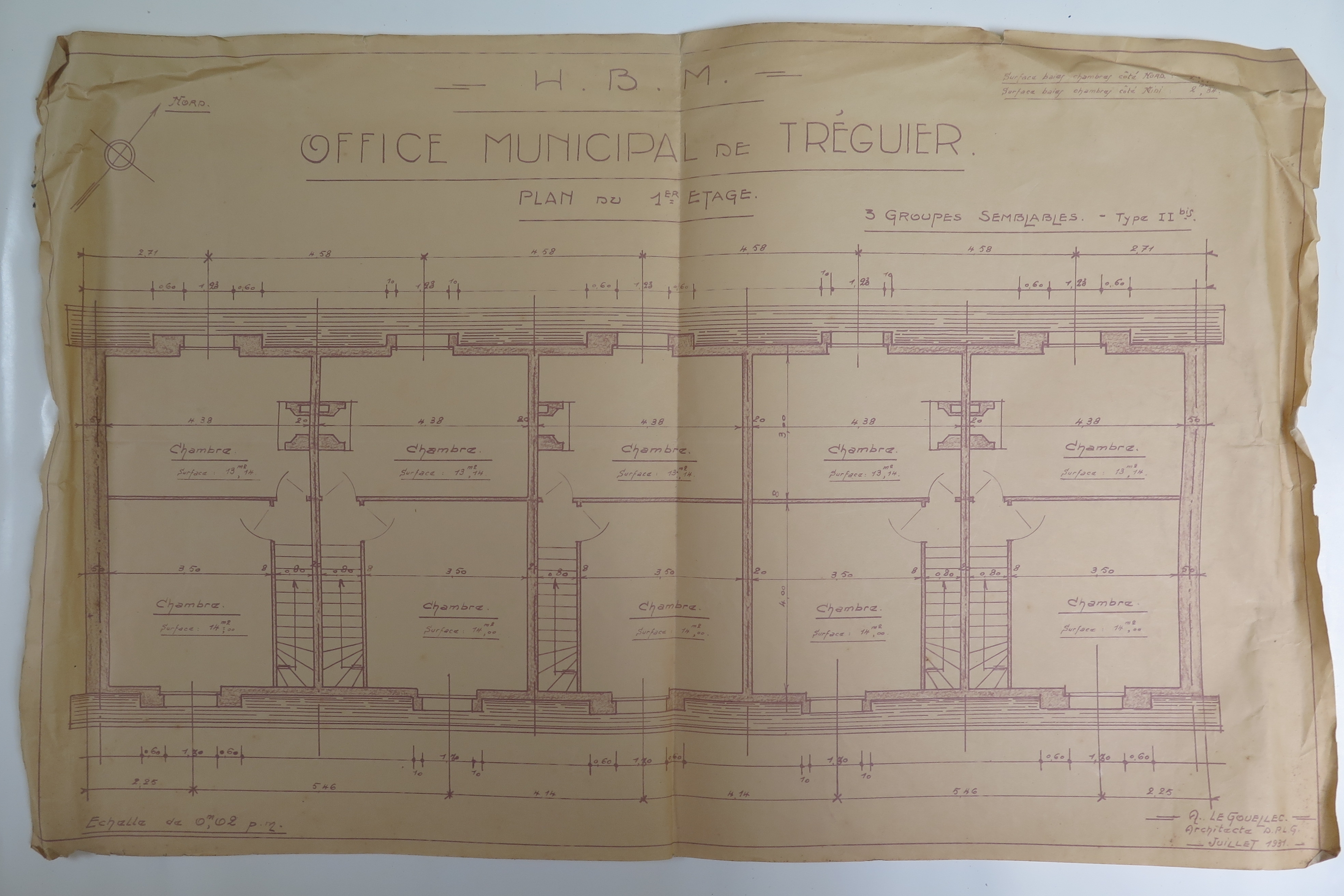 Tréguier : habitations à bon marché, 3 groupes semblables, type II bis, plan du premier étage (étage en surcroît), projet de l'architecte Le Gouëllec de Saint-Brieuc, 1er juillet 1931 (Archives municipales de Tréguier, 1W5)Immatriculation
