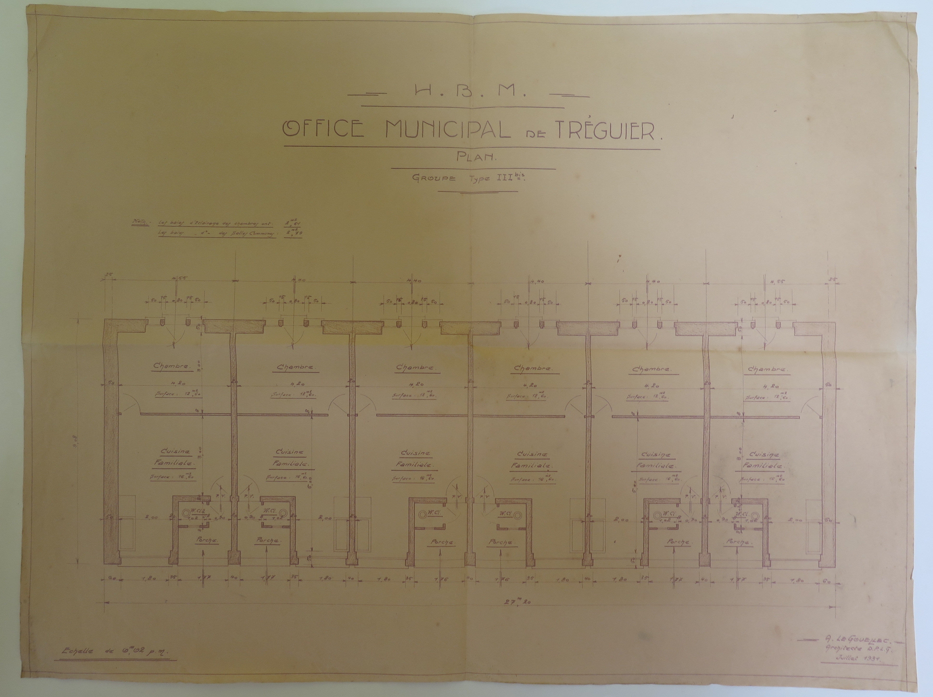 Tréguier : habitations à bon marché, groupe type III bis, plan du rez-de-chaussée, projet de l'architecte Le Gouëllec de Saint-Brieuc, 1er juillet 1931 (Archives municipales de Tréguier, 1W5)Immatriculation