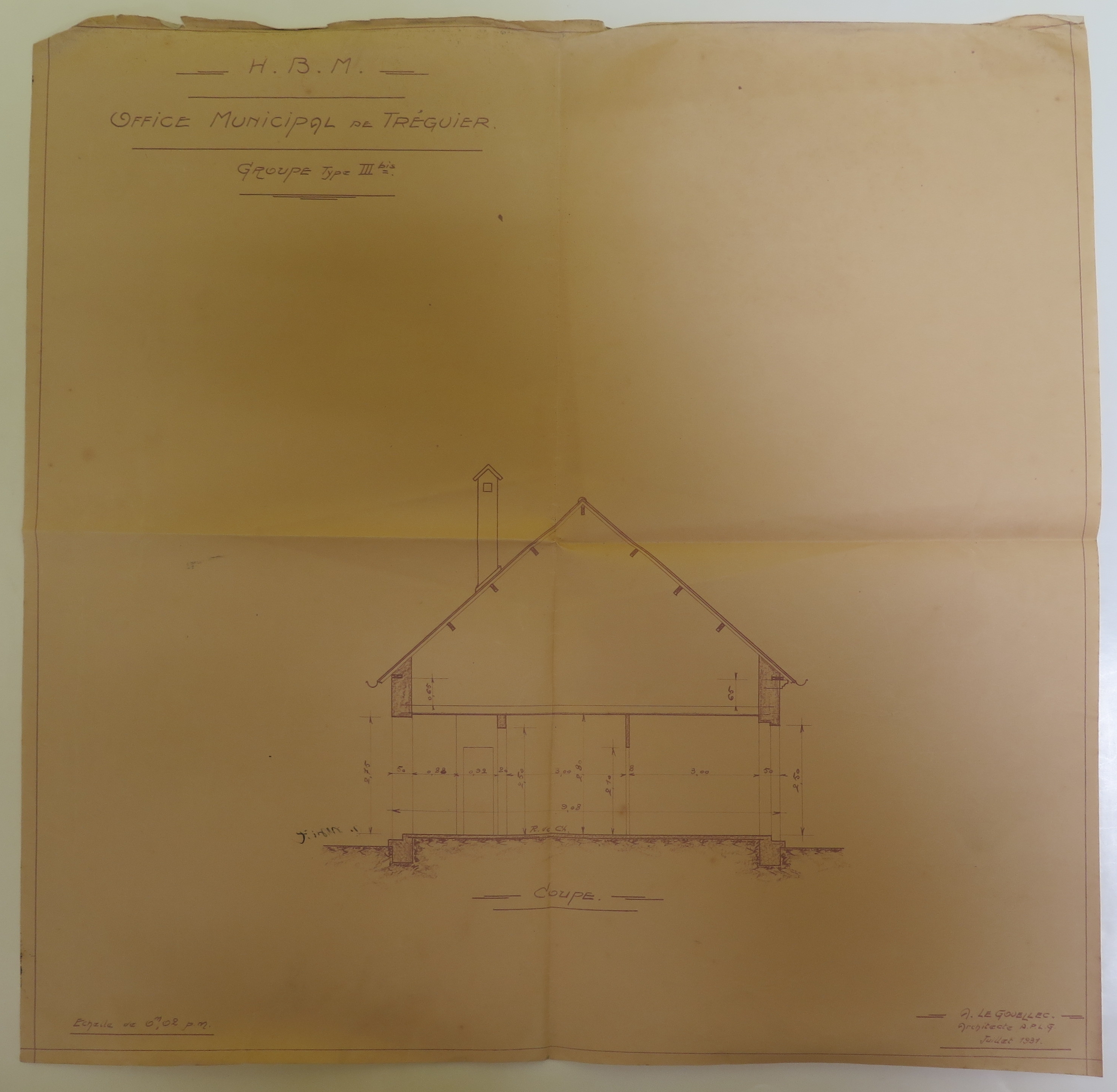 Tréguier : habitations à bon marché, groupe type III bis, coupe, projet de l'architecte Le Gouëllec de Saint-Brieuc, 1er juillet 1931 (Archives municipales de Tréguier, 1W5)Immatriculation