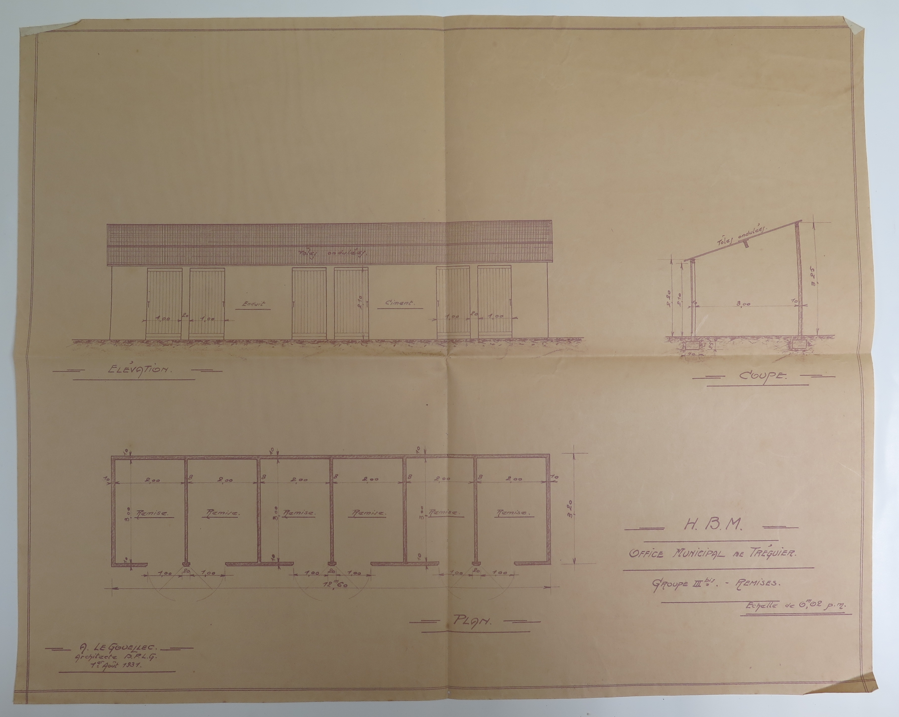 Tréguier : habitations à bon marché, groupe type III bis, plan des remises, projet de l'architecte Le Gouëllec de Saint-Brieuc, 1er août 1931 (Archives municipales de Tréguier, 1W5)Immatriculation