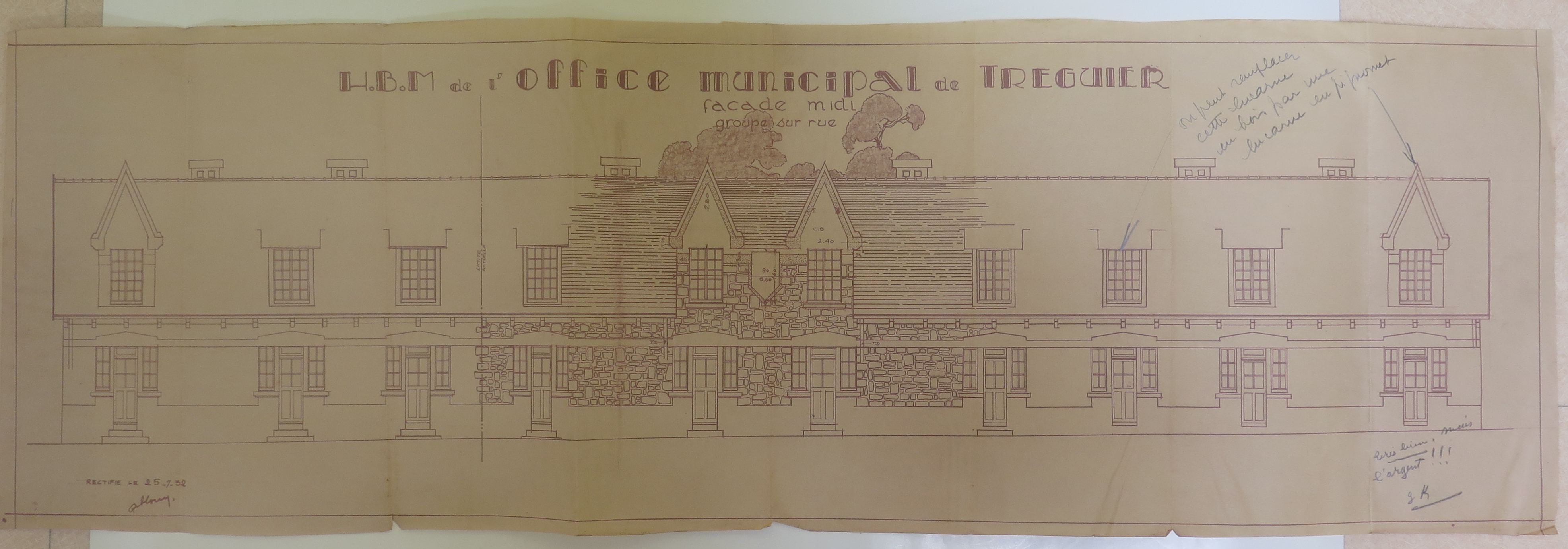 Tréguier : habitations à bon marché, groupe sur rue, élévation/façade sud, projet de l'architecte Le Gouëllec de Saint-Brieuc, 25 juillet 1932 (Archives municipales de Tréguier, 1W5). Cette élévation a été annotée, on peut ainsi lire : "on peut remplacer cette lucarne en bois par une lucarne en pignonnet" (ce qui fut fait) et le commentaire de Gustave de Kerguezec : "très bien, mais l’argent !!!"Immatriculation