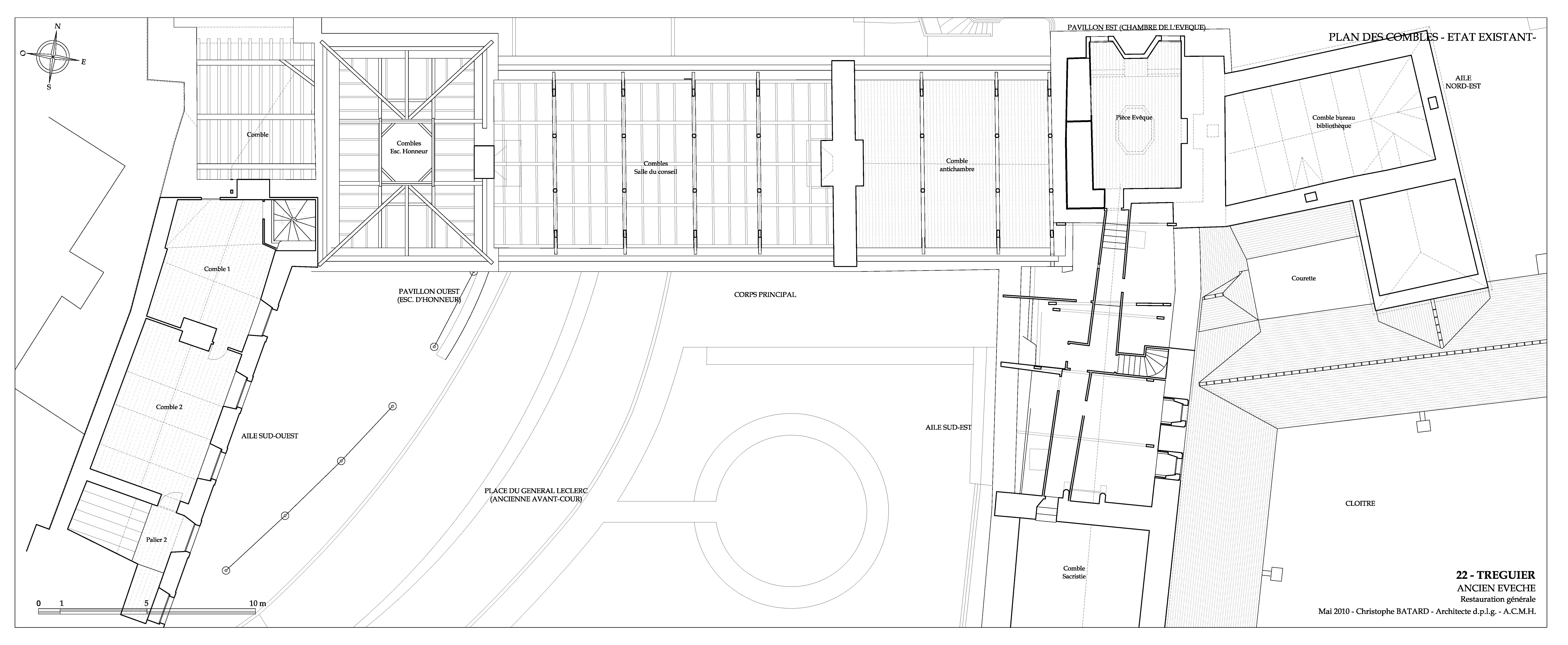 Tréguier, boulevard Anatole Le Braz : palais épiscopal aujourd'hui mairie et bibliothèque, plan de l'étage de comble, état actuel, 1/200ème (extrait de l'étude préalable à la restauration générale de l'ancien évêché de Tréguier sous la direction de Christophe Batard, architecte en chef des monuments historiques, 2010)Immatriculation