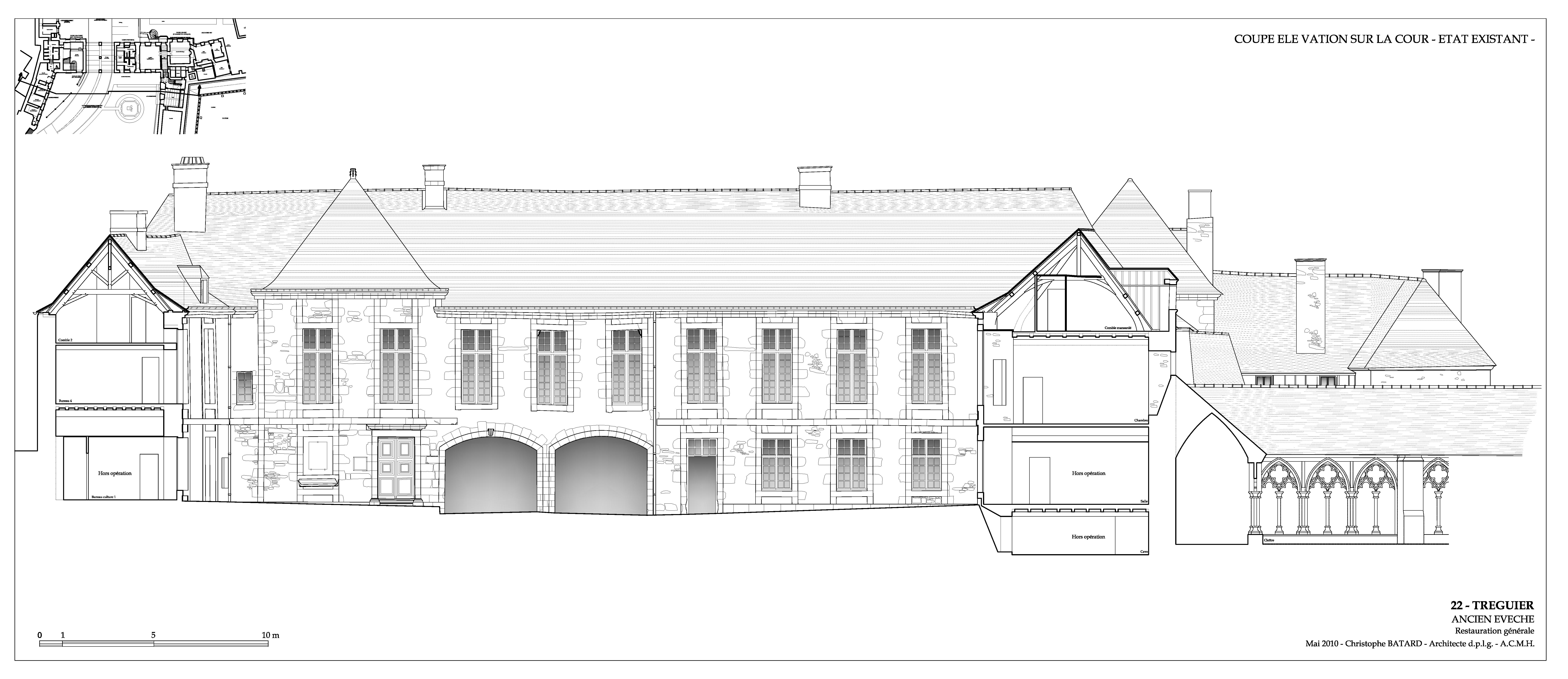 Tréguier, boulevard Anatole Le Braz : palais épiscopal aujourd'hui mairie et bibliothèque, élévation sur cour, état actuel, 1/100ème (extrait de l'étude préalable à la restauration générale de l'ancien évêché de Tréguier sous la direction de Christophe Batard, architecte en chef des monuments historiques, 2010)Immatriculation