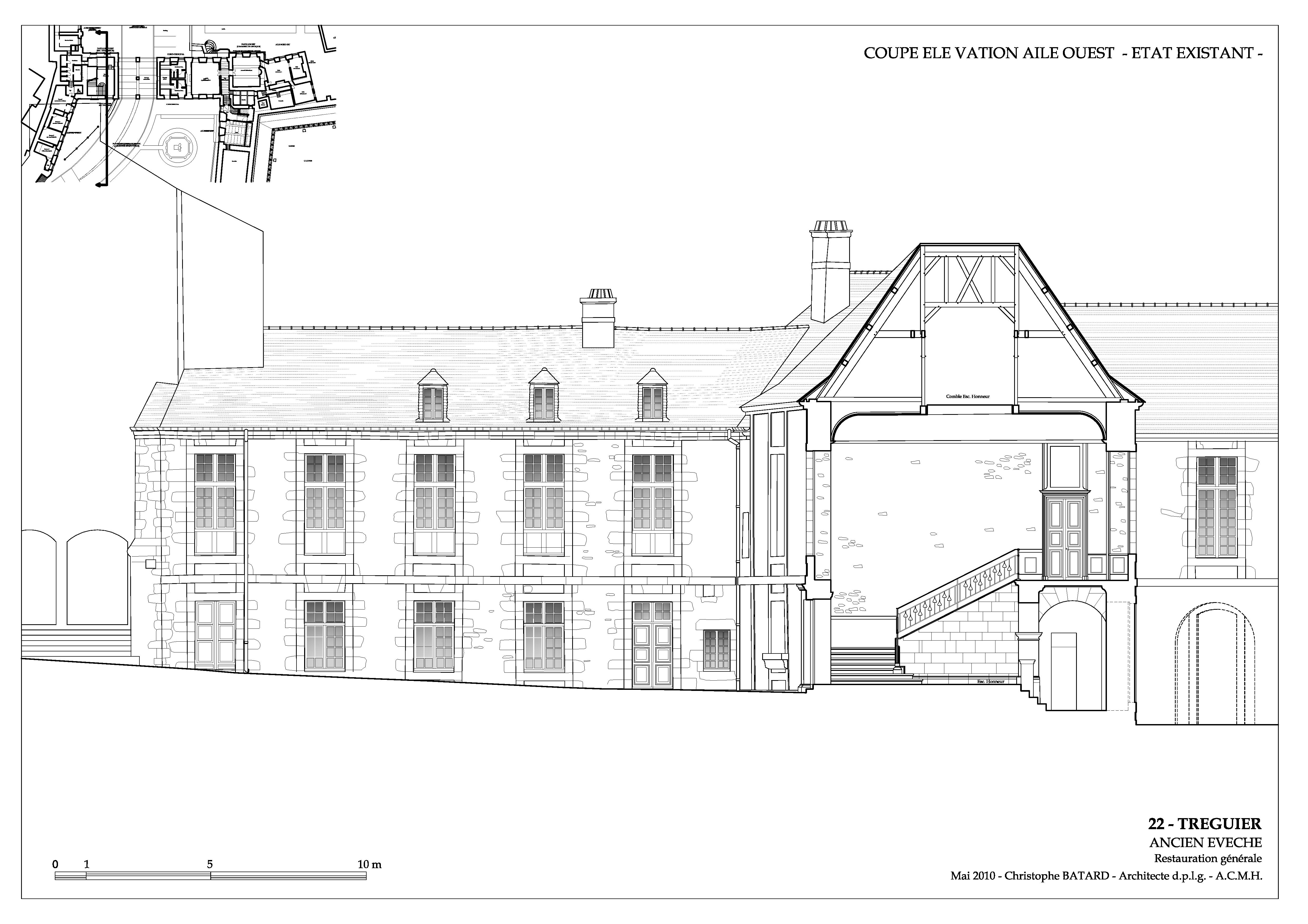Tréguier, boulevard Anatole Le Braz : palais épiscopal aujourd'hui mairie et bibliothèque, coupe sur le vestibule et l'escalier d'honneur et aile sud-ouest, état actuel, 1/100ème (extrait de l'étude préalable à la restauration générale de l'ancien évêché de Tréguier sous la direction de Christophe Batard, architecte en chef des monuments historiques, 2010)Immatriculation