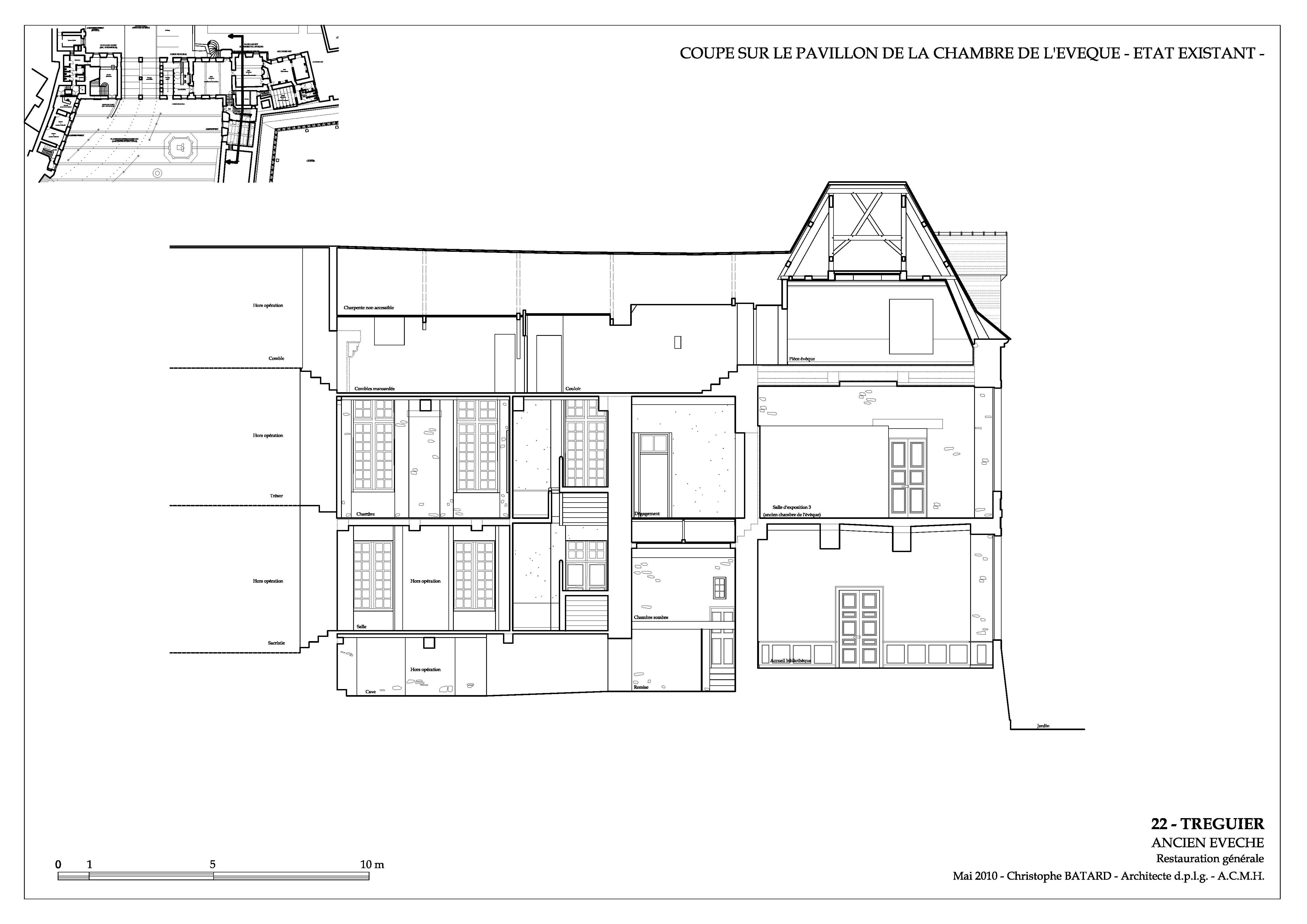 Tréguier, boulevard Anatole Le Braz : palais épiscopal aujourd'hui mairie et bibliothèque, coupe sur le pavillon est et l'aile sud-est, état actuel, 1/100ème (extrait de l'étude préalable à la restauration générale de l'ancien évêché de Tréguier sous la direction de Christophe Batard, architecte en chef des monuments historiques, 2010)Immatriculation