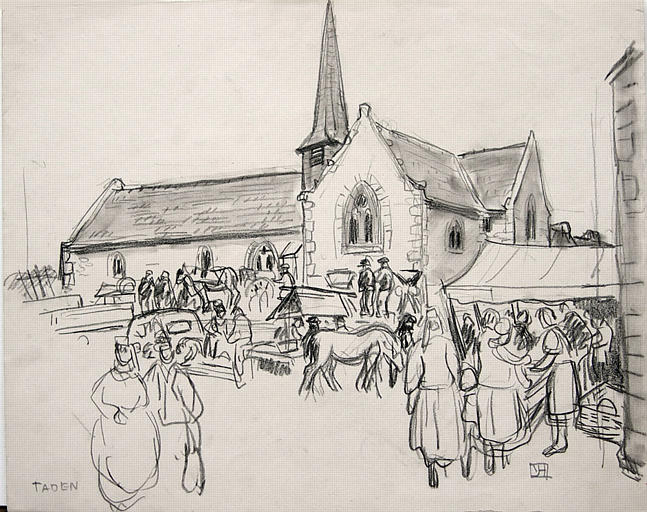 Marché autour de l'église, vue sud-est, croquis par Yvonne jean-Haffen, vers 1944Immatriculation