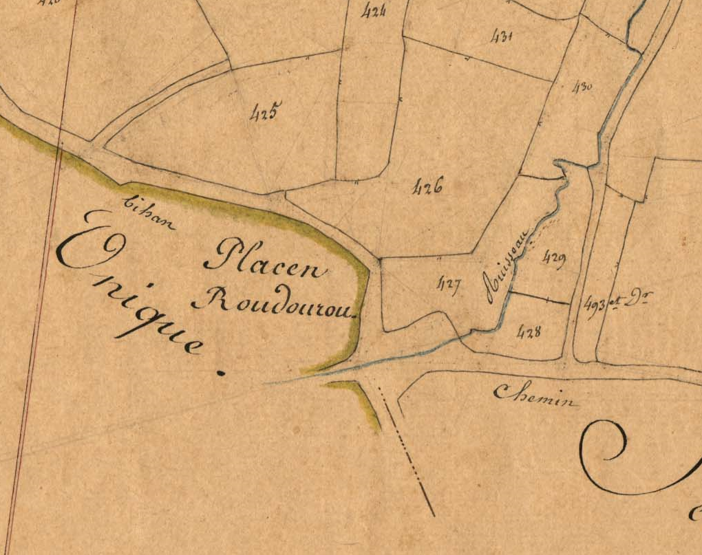 Détail du cadastre napoléonien de 1834, section A feuille 1. La place du Roudourou.Immatriculation