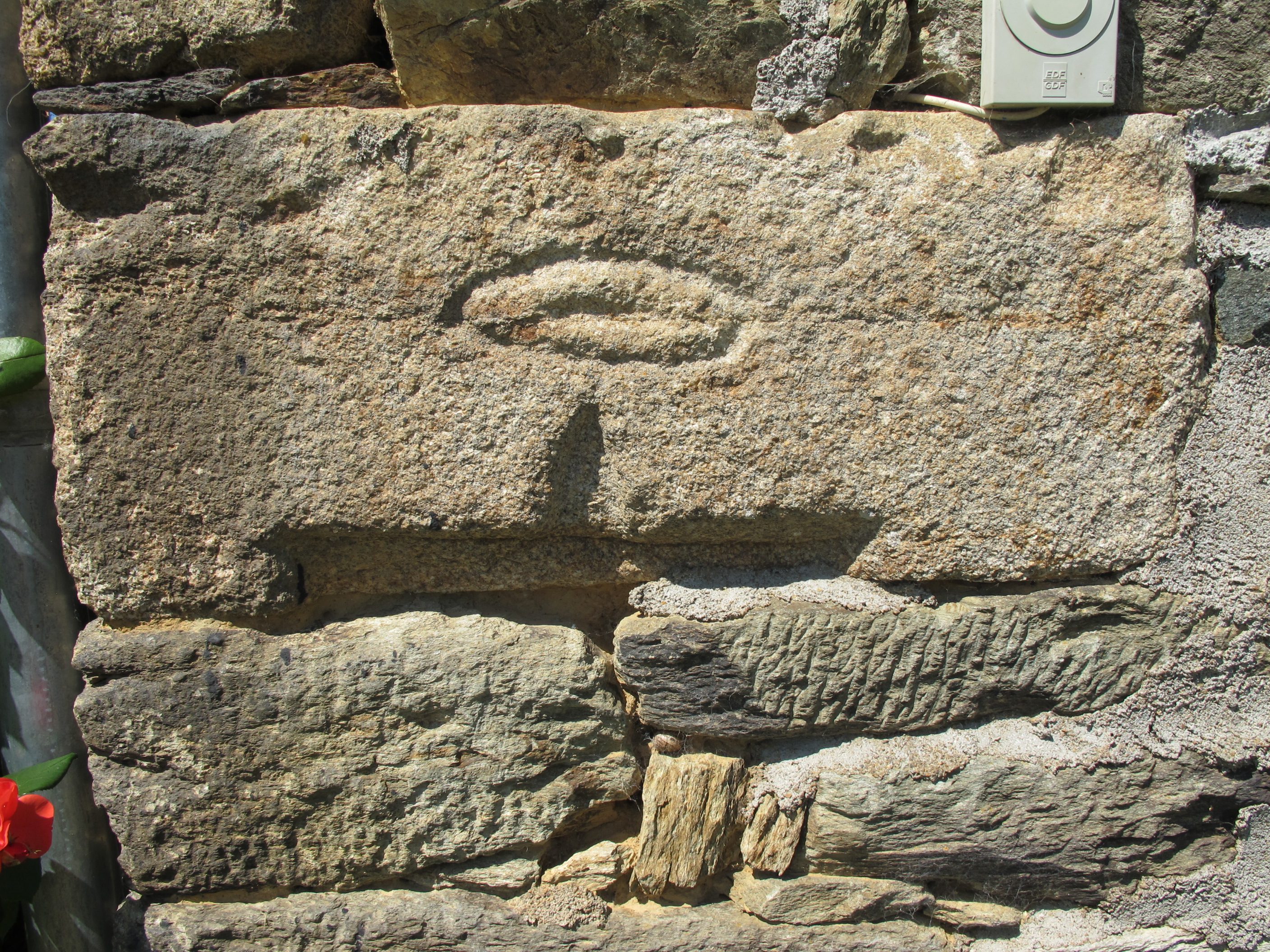 6 rue Convenant Donné. Grange. Détail d'un motif de navette de tisserand gravé sur un linteau remployé dans le chaînage d'angleImmatriculation