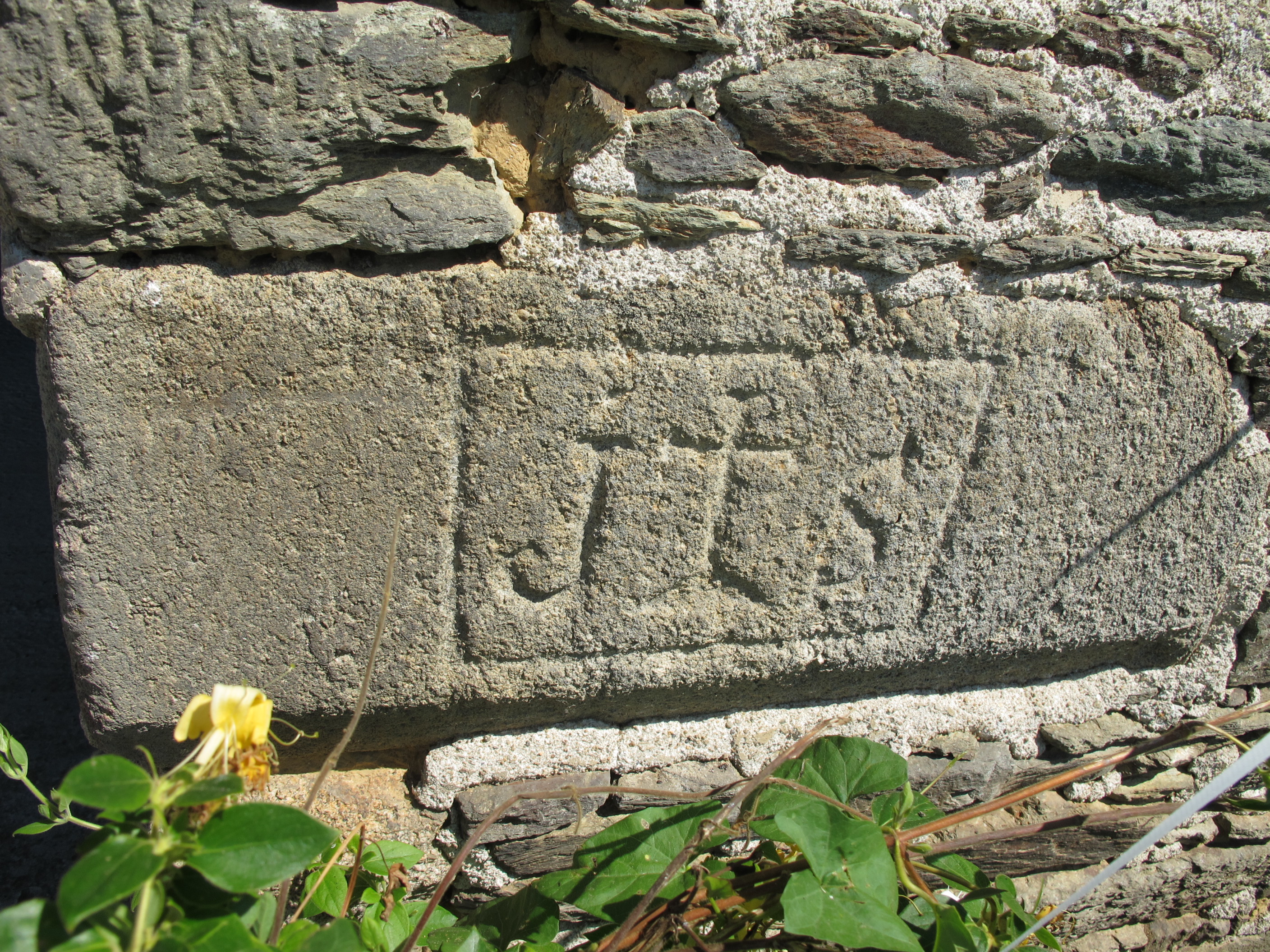 6 rue Convenant Donné. Grange. Détail du monogramme IHS gravé sur une pierre du chaînage d'angleImmatriculation