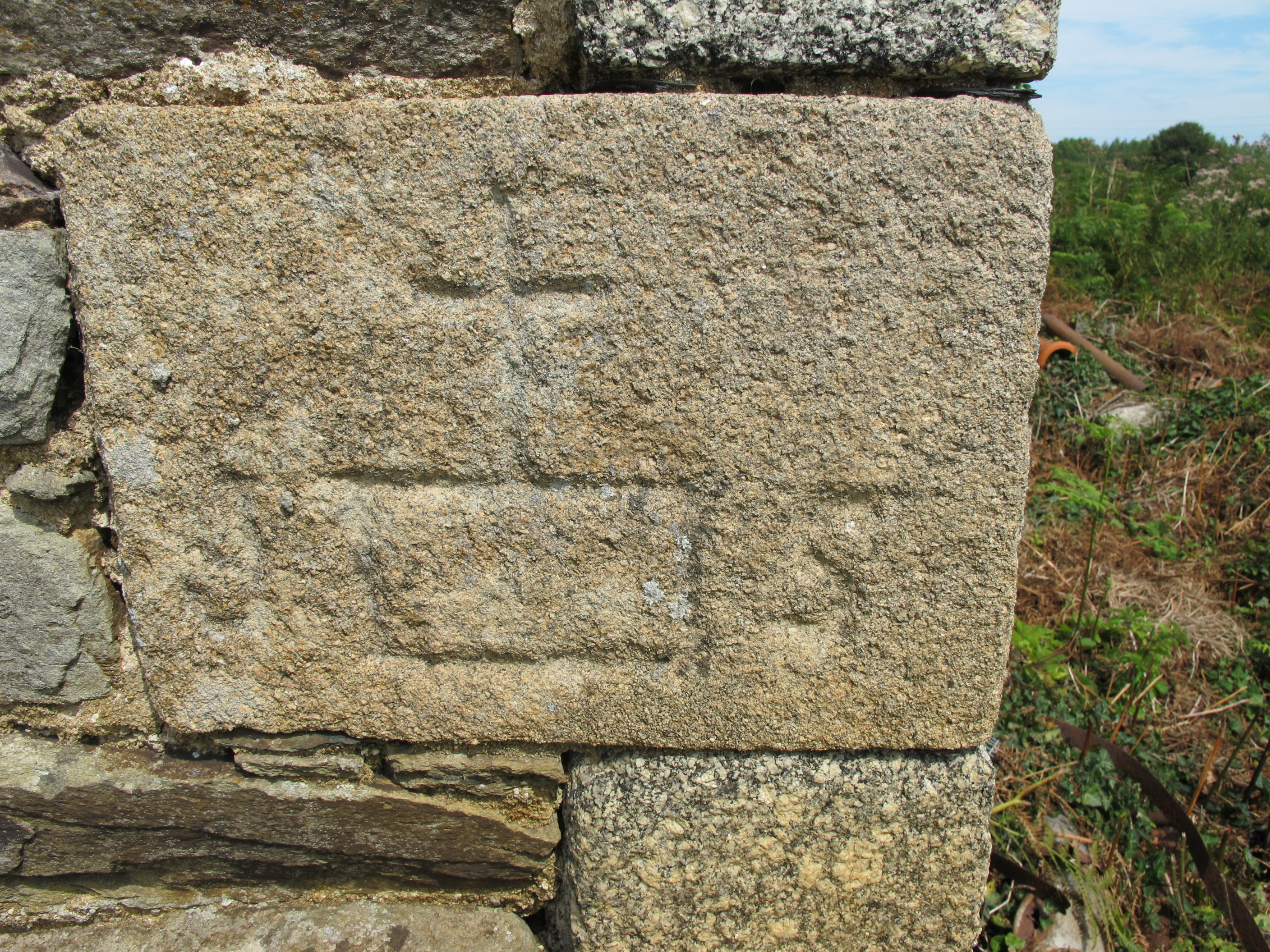16 rue de Kerello. Grange. Détail d'une pierre du chaînage d'angle portant le monogramme du Christ "IHS"Immatriculation
