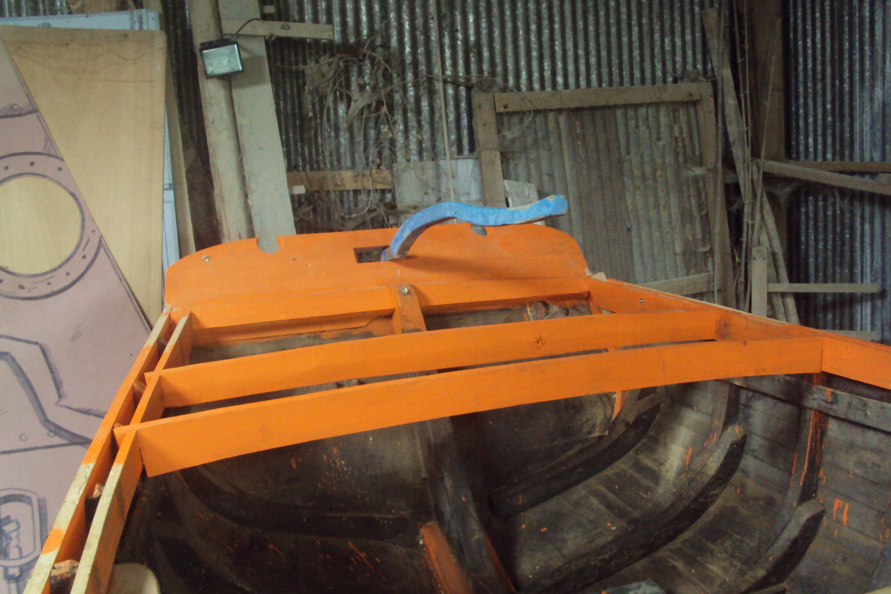 Vue du barrotage arrière et du tableau en partie restauréImmatriculation
