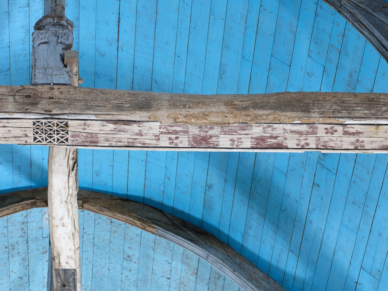 Charpente peinte de la nef : entrait à déor de croix et de fleurs, détailImmatriculation