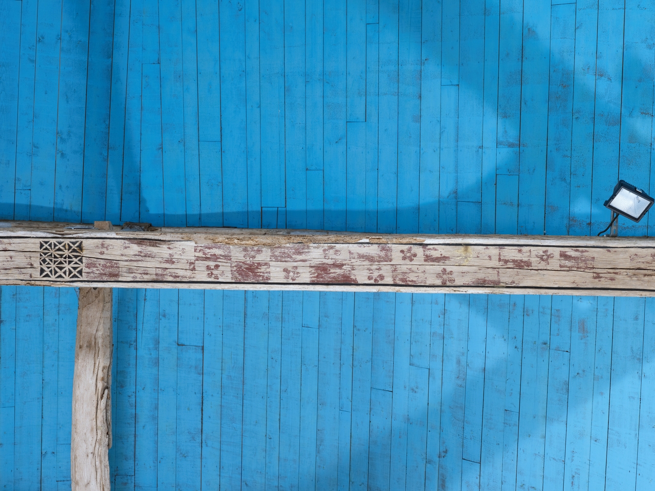 Charpente de la nef ; entrait à décor échiqueté rouge et fleursImmatriculation