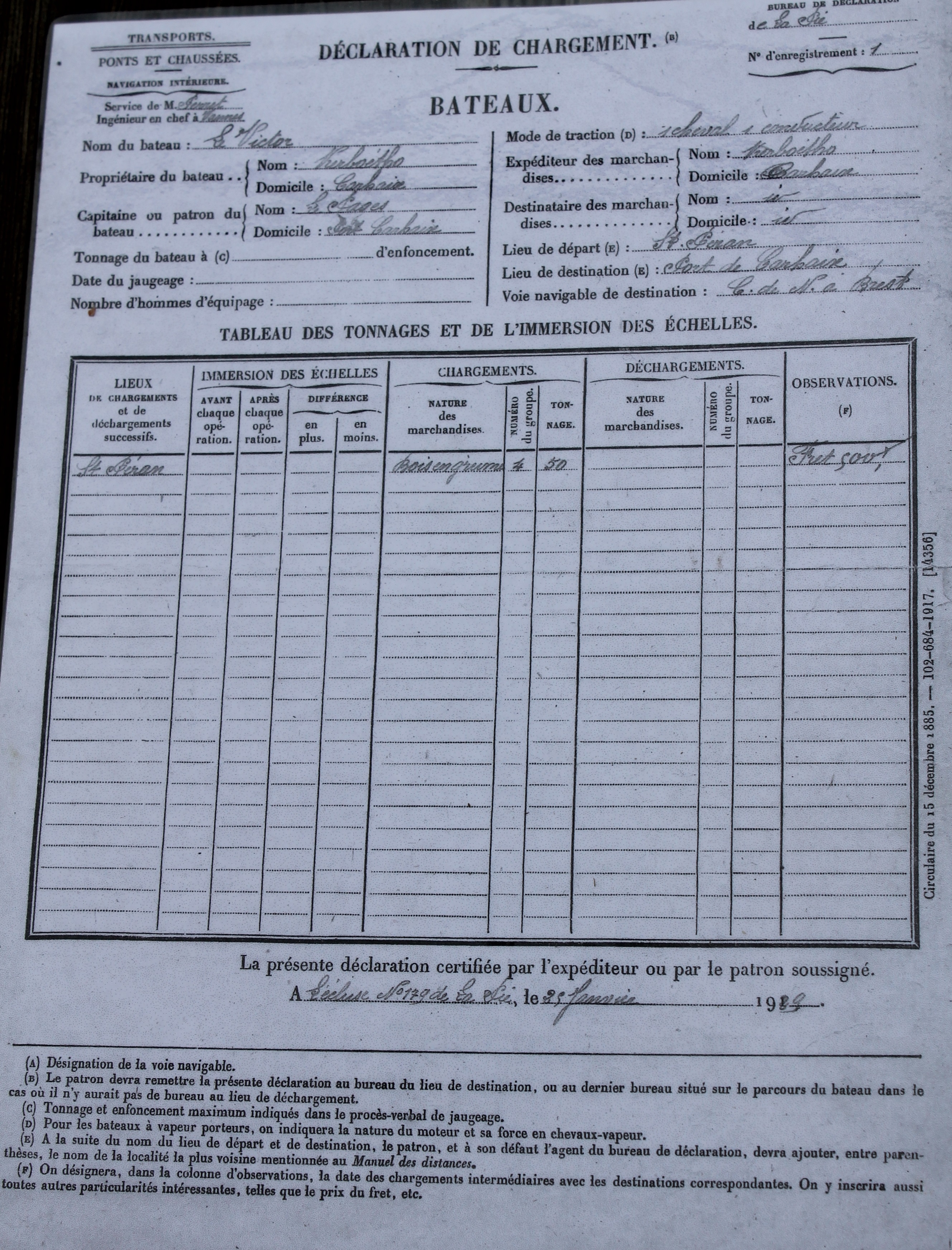 Chaland Victor, Saint Gouazec, déclaration de chargement de 1929Immatriculation