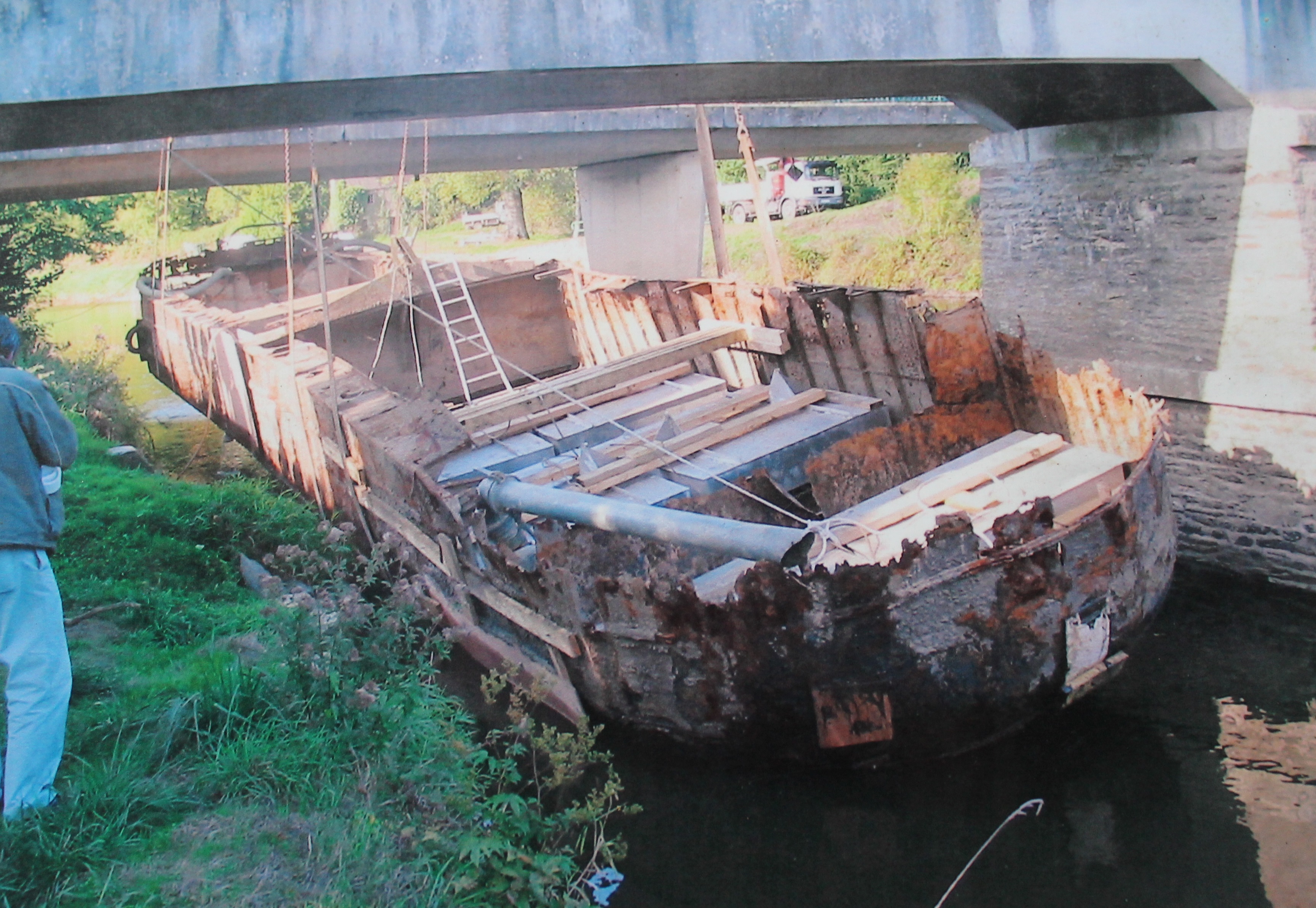 Chaland Victor, Saint Gouazec, préparation du chaland avant le grutage, les flancs sont consolidésImmatriculation
